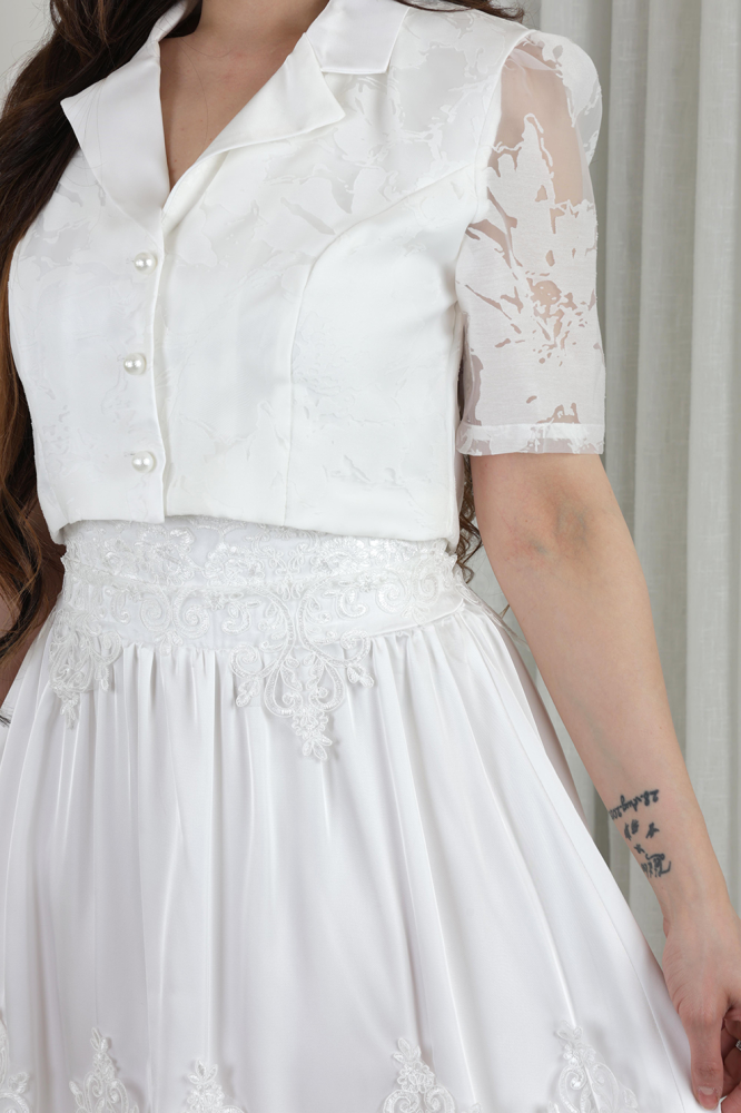 بلوزرة اورجنزا ناعم بطابع النقش بياقة قلاب بأكمام قصيرة بأزرار لؤلؤ من الامام.