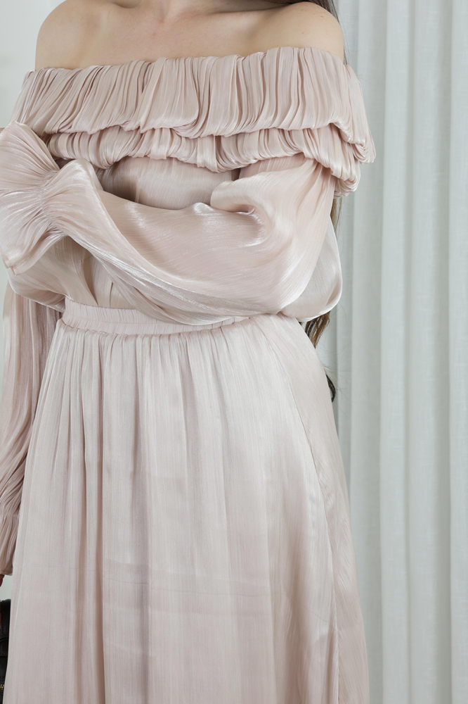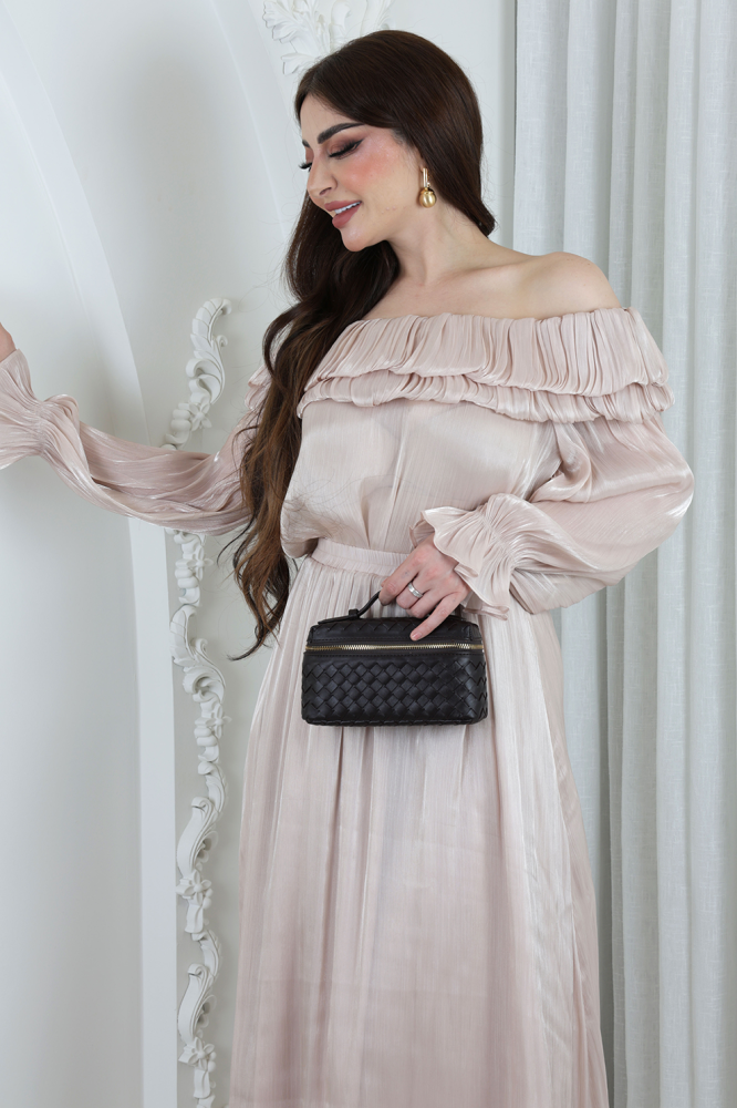 بلوزة اورجنزا ناعم حفر بأكمام طويلة مكشوفة من الاكتاف مزينة بطبقات مكشكشه على الصدر .