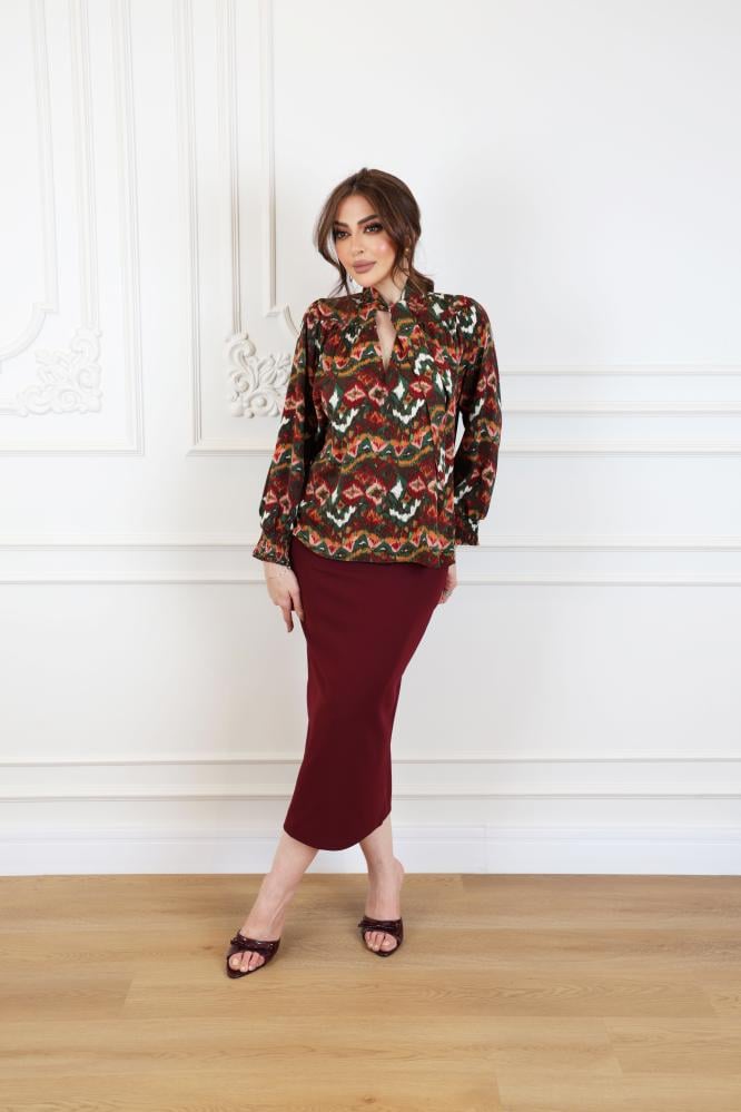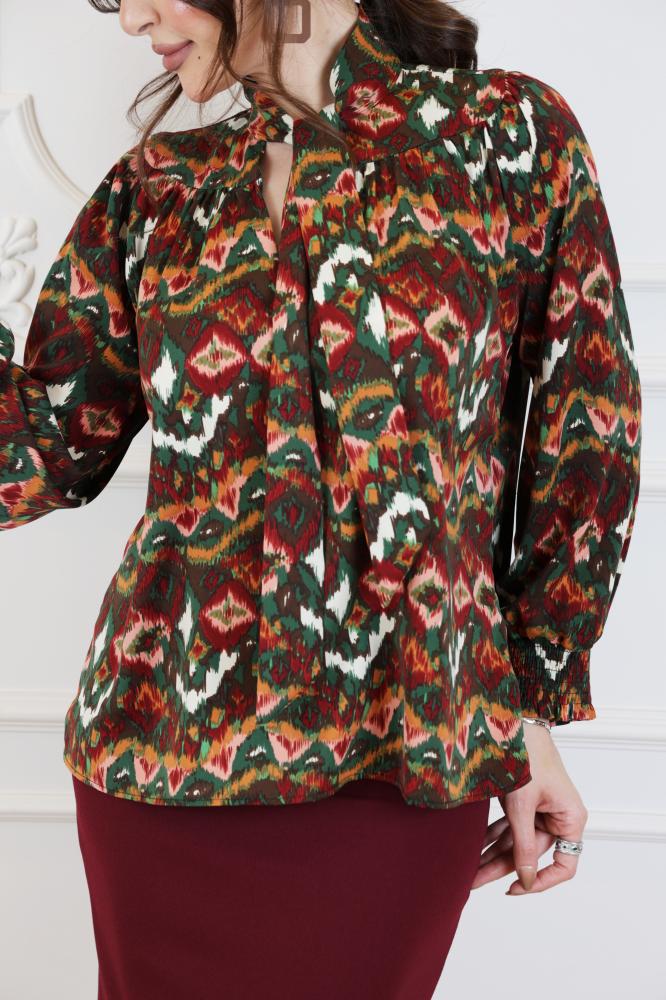 تميّزي بألوان دافئة ونقشة آسرة مع هذه البلوزة المصممة بطبعة هندسية مستوحاة من النقوش القبلية التقليدية، والتي تدمج ببراعة بين الأحمر، البرتقالي، الأخضر، والبيج على خلفية داكنة. تصميمها العصري مع ربطة عنق أنثوية، وأكمام طويلة بنهايات مطاطية مجمعة يضفيان لمسة من الأناقة والراحة في آنٍ واحد.