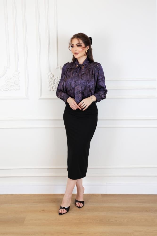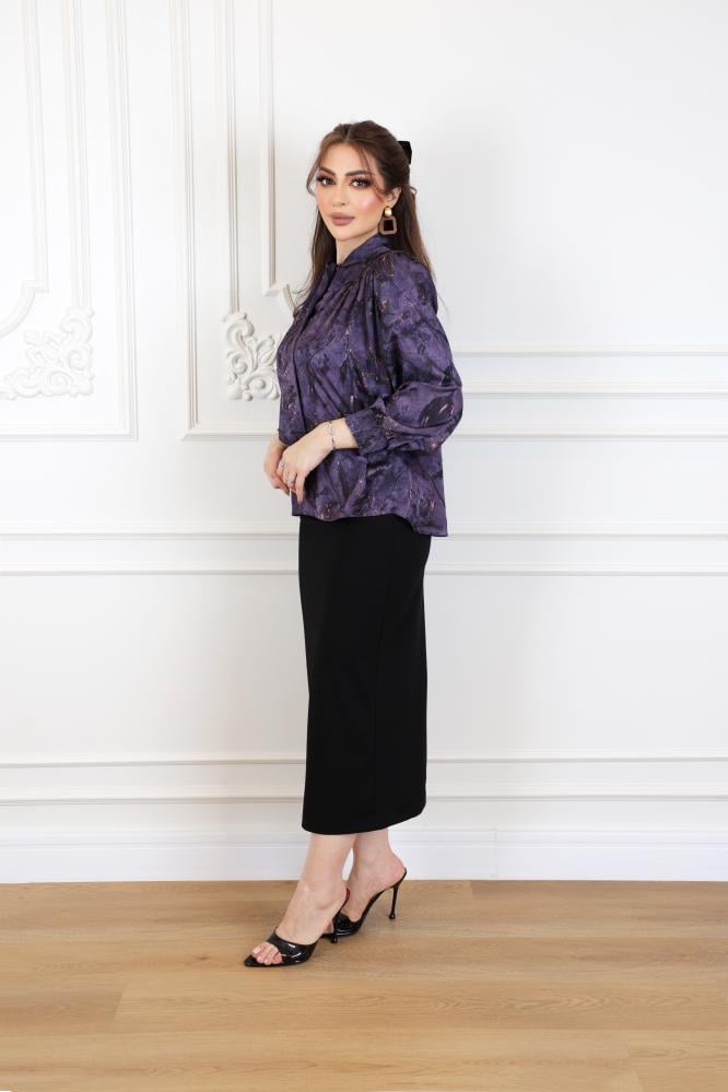 بلوزة بلون بنفسجي غامق بطبعة فنية عصرية – نعومة راقية بإحساس فني مختلف