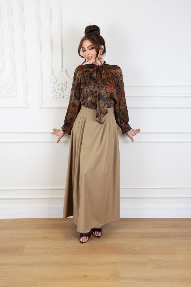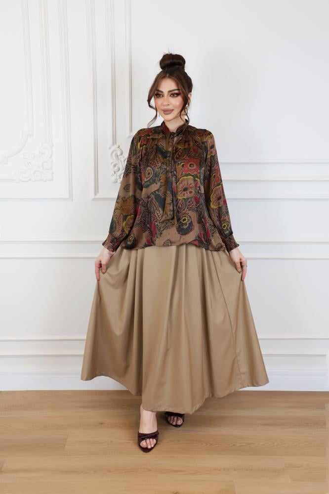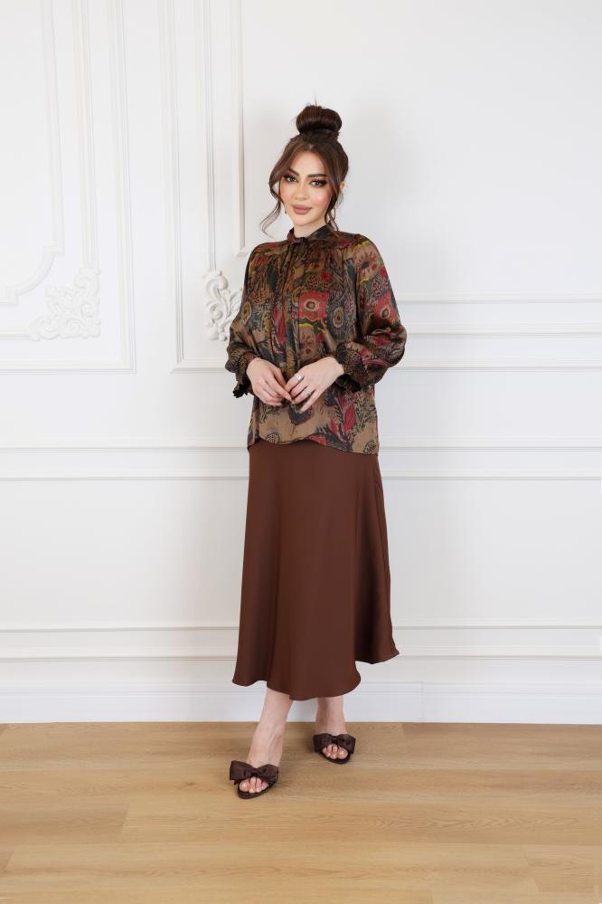 بلوزة ستان بطابع رسم برباط على الرقبة بأكمام طويلة بزم مكشكش على الأطراف