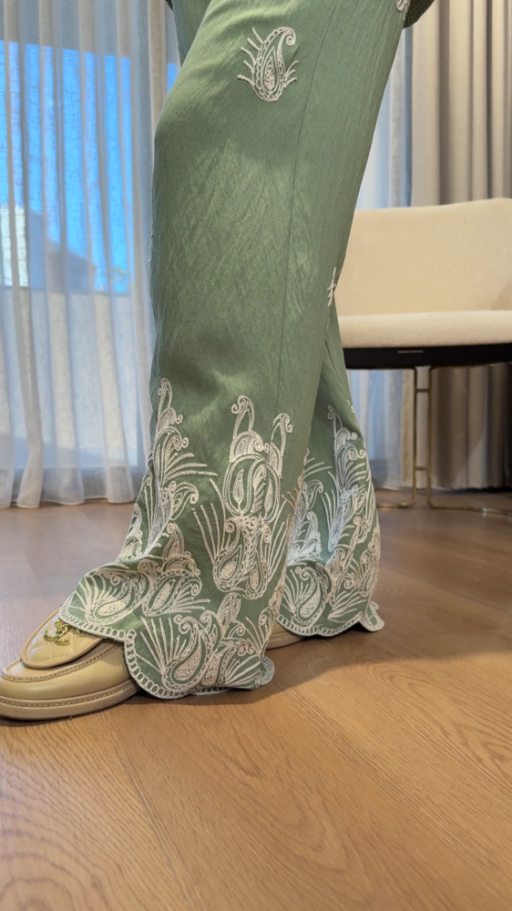 بنطلون بلون اخضر فاتح بقماش خفيف ومريح. مزين بتطريزات متناثرة من نقوش البايزلي البيضاء، مع تركيز فاخر للتطريز عند أسفل الأرجل.