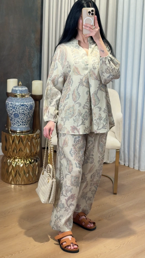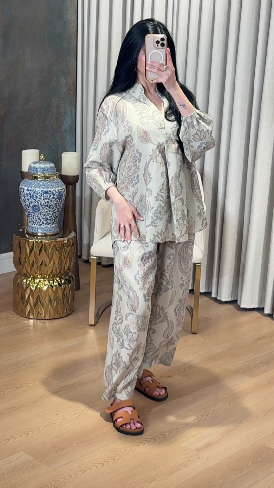 بنطلون بقماش مزخرف بنقشة بايزلي برسومات نباتية بألوان هادئة، بقصة مستقيمة وفضفاضة توفّر راحة وأناقة في اللبس. النقشة الناعمة تعطيه طابع كلاسيكي فخم، مثالي للإطلالات اليومية أو السفر.