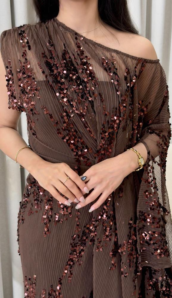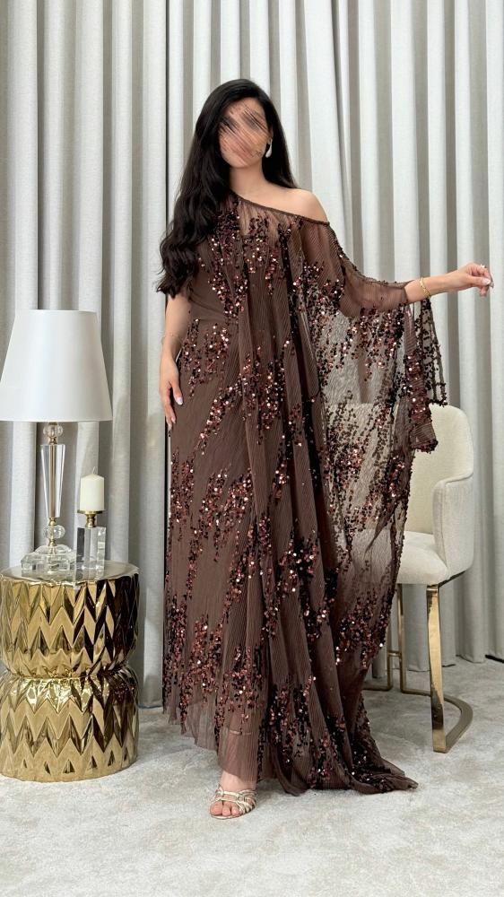 جلابية سهرة شك باللون الموكا ، بتصميم أنثوي أنيق مطرز بالترتر اللامع.