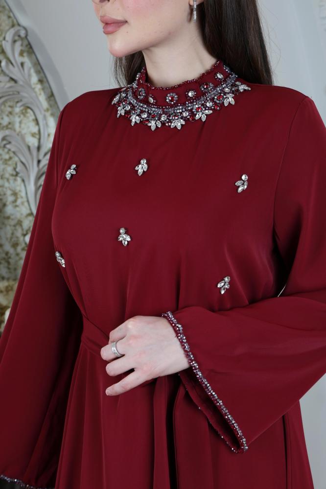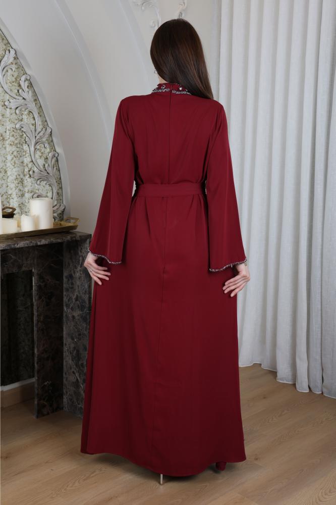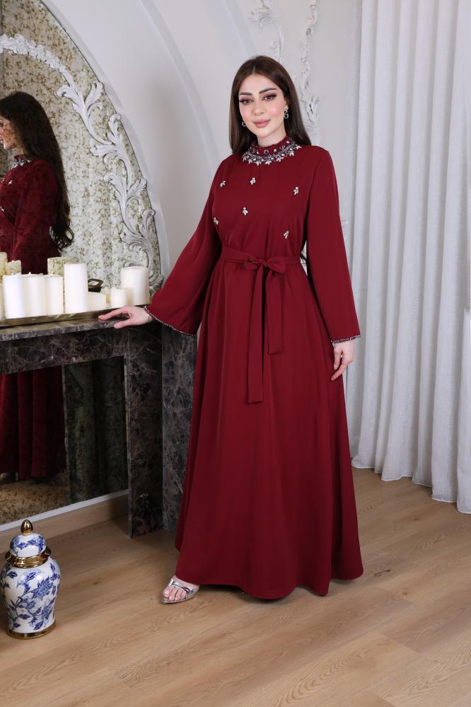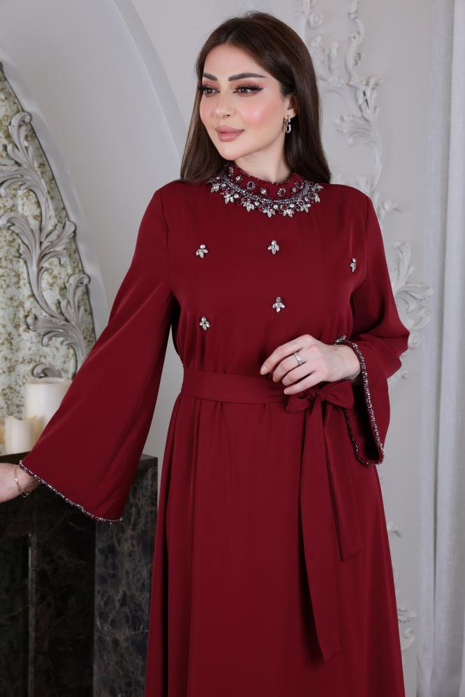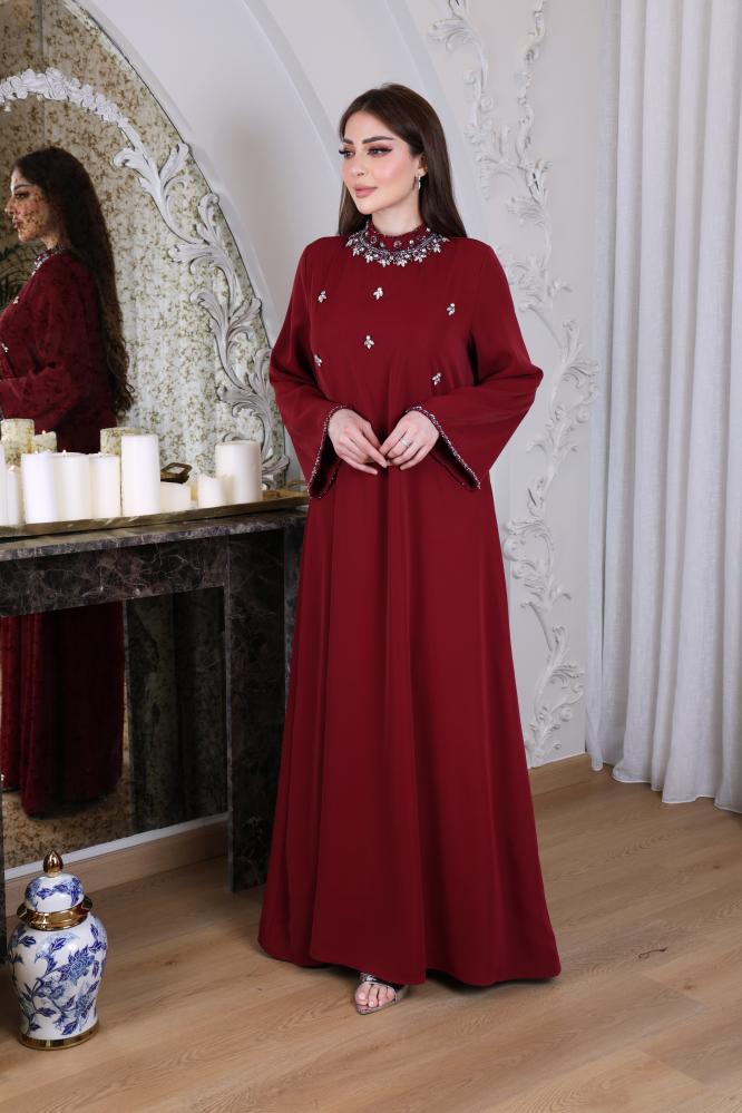 جلابيه كريب حرير ببياقة مرتفعة مزينة بشك ومرصعة بكريستال على الرقبة و الصدر واطراف الاكمام