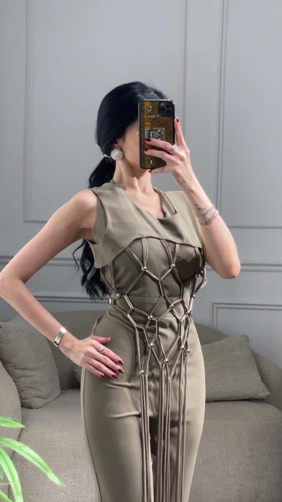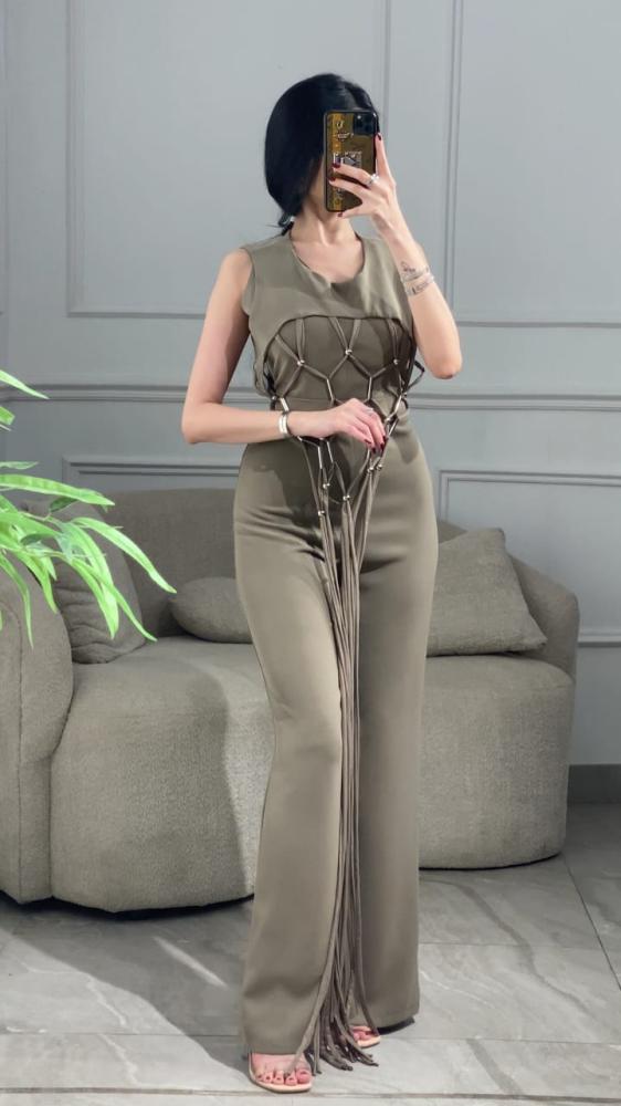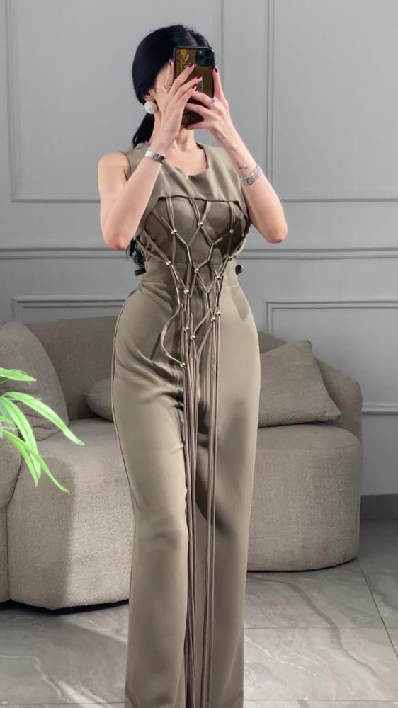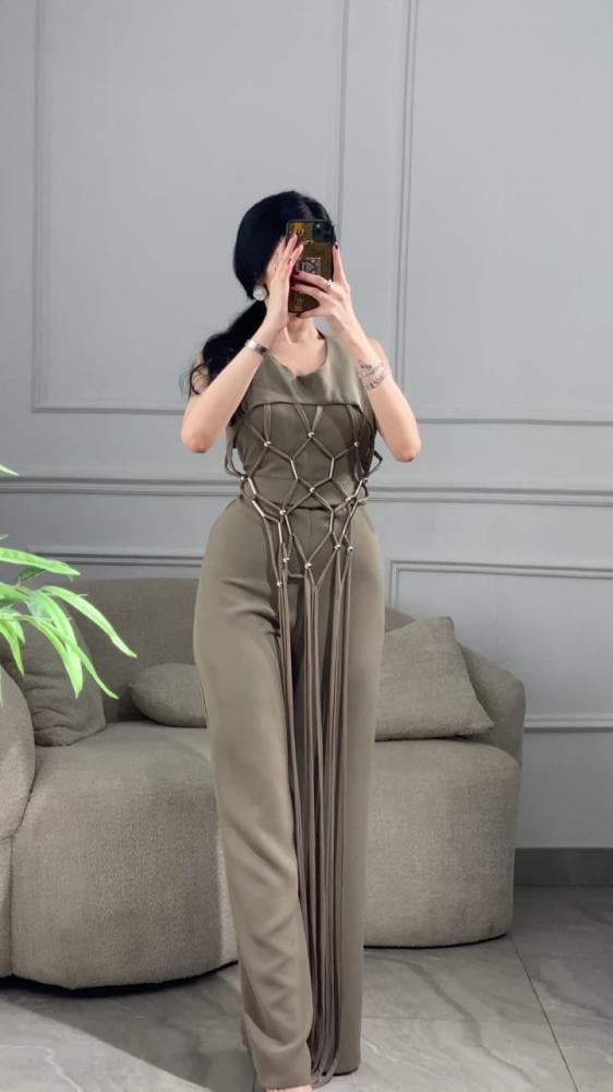 جمبسوت طويل كريب قطعتين بقصه واسعة مزين بقطعة خارجية مزينه بحبال بشكل شبكي