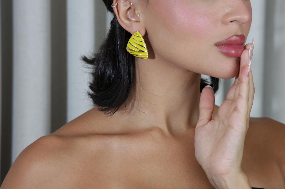 تميّزي بإطلالة مفعمة بالحيوية مع هذا الحلق اللافت المصمم بشكل مثلث منحني بلمسة فنية غير متناظرة. يتألق بلون أصفر لامع جريء، تتخلله خطوط مموجة بتأثير معدني ذهبي تبرز بأسلوب ديناميكي وكأنها ضربات فرشاة على لوحة فنية حديثة.