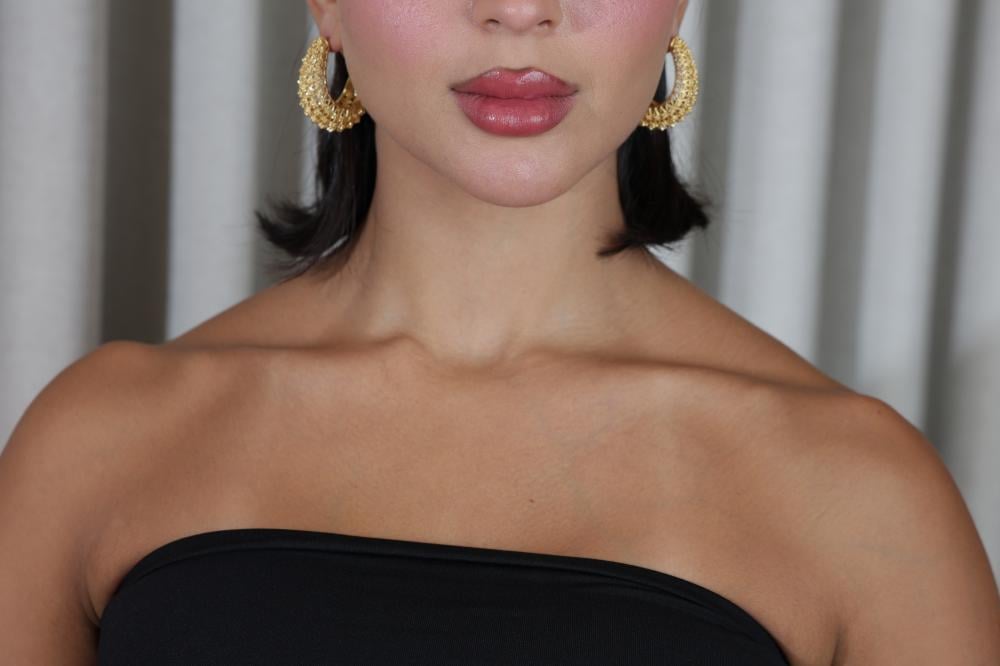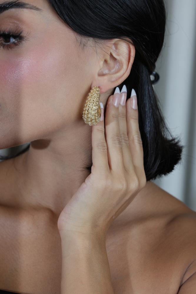 دعِي الأناقة تتحدث عنك مع هذا الحلق الذهبي الساحر الذي يمزج بين الحرفية الدقيقة والجرأة الجمالية. تصميم نصف دائري سميك بسطح شبكي مجسم يتخلله تداخل معقد بلمعة ذهبية ، يمنحك إطلالة ملكية تشع بالضوء وتلفت الأنظار من اللحظة الأولى.