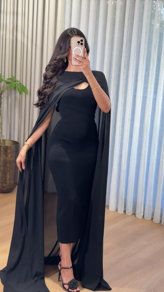 شال بتصميم كيب طويل، مصنوع من قماش انسيابي شيفون أسود بخامة خفيفة تنسدل بنعومة فوق الأكتاف. يتميز بقصة مفتوحة من الأمام تسمح بإبراز تفاصيل الفستان تحته، مع امتداد جانبي يغطي الذراعين بشكل أنيق، ويمنح لمسة ساحرة وكأنها جناحين من الفخامة.