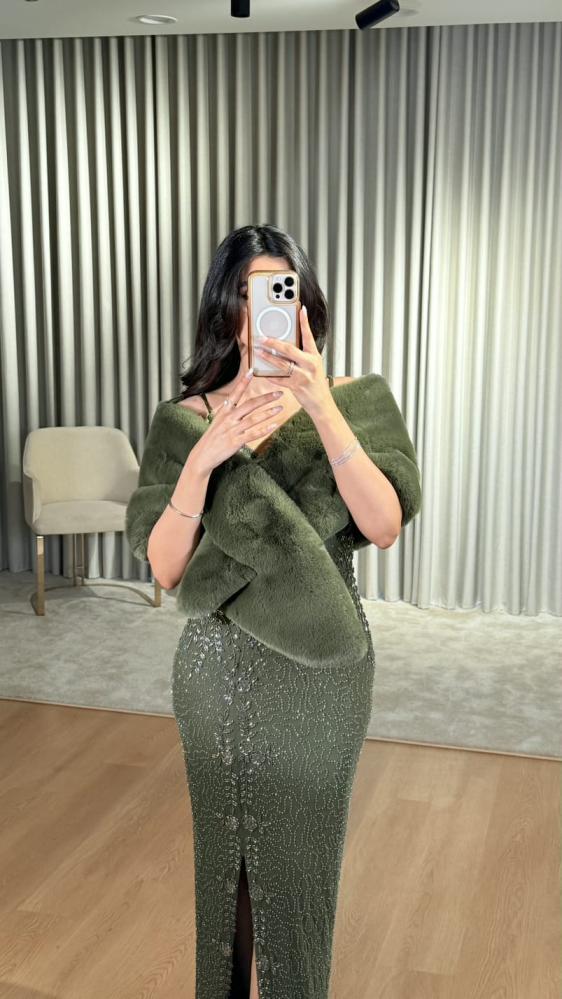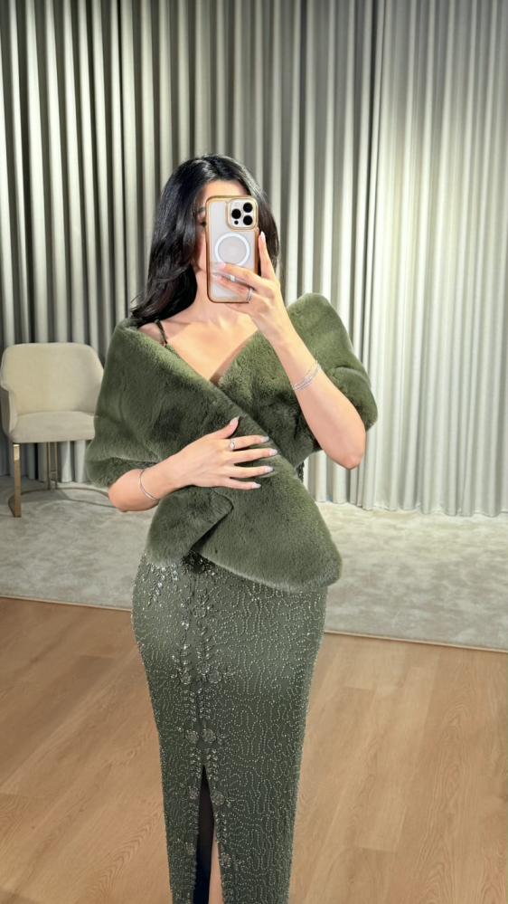تألقي بأناقة فريدة مع شال الفرو الزيتي الذي يجمع بين الفخامة واللمسة العصرية.