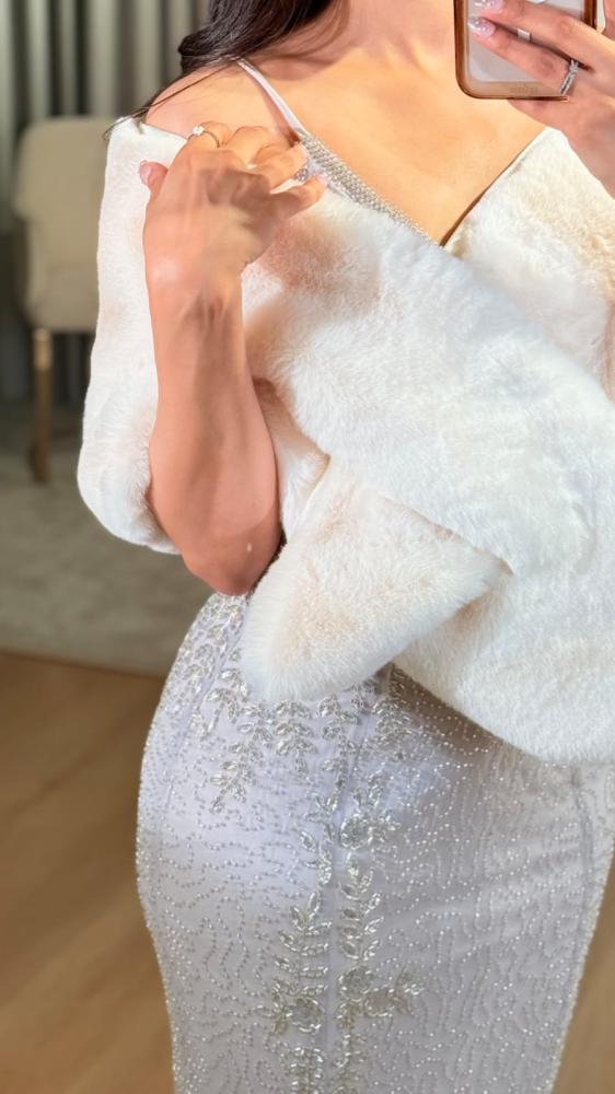 لمسة أنوثة ناعمة تجتمع في هذا الشال الفرو السكّري البيج، المصمم ليناسب المناسبات الفاخرة وحفلات الزفاف والخطوبة.