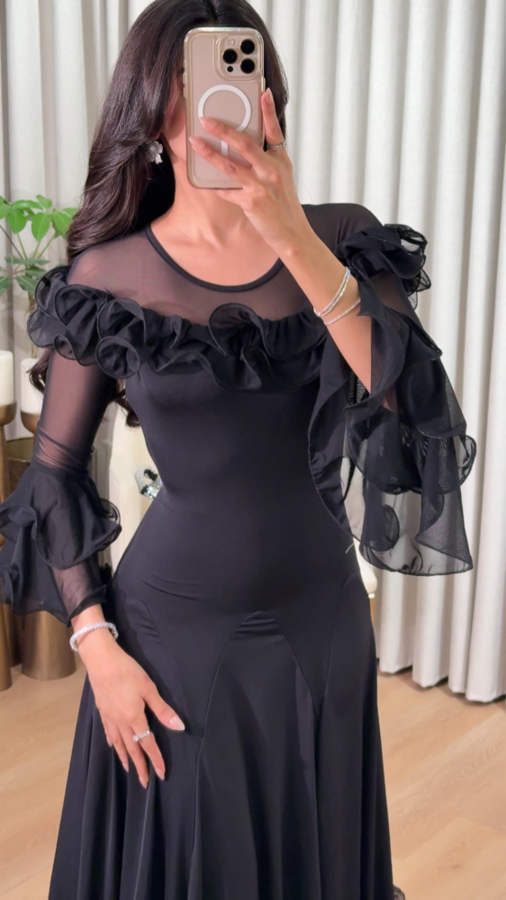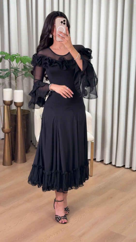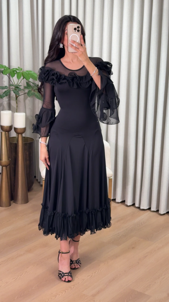 فستان اسود استرتش مزين بكشكشه على الصدر والاكمام ومن الأسفل