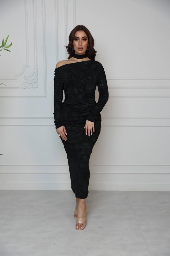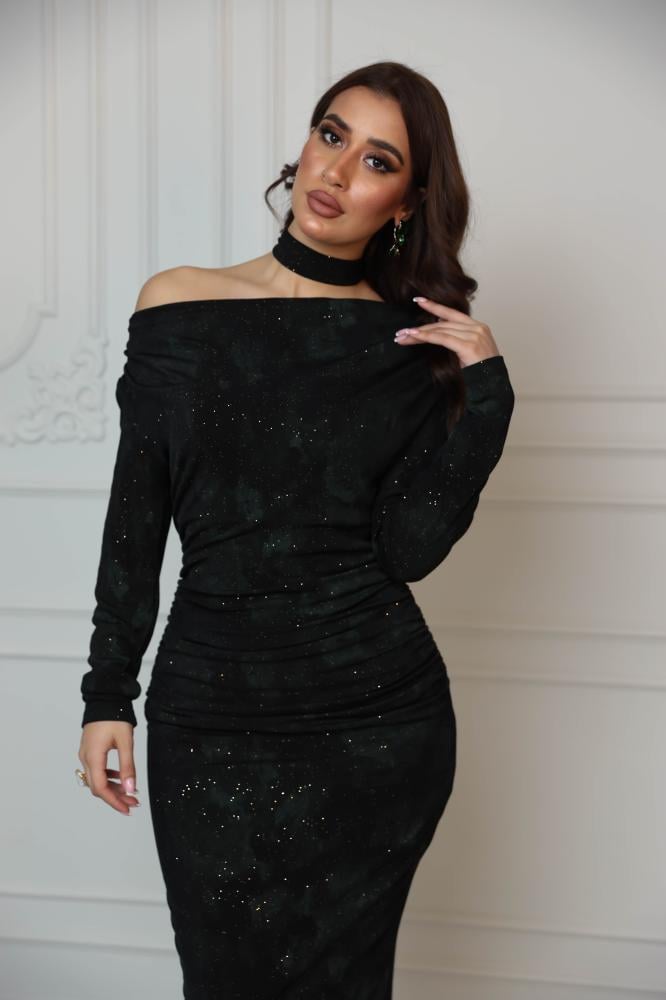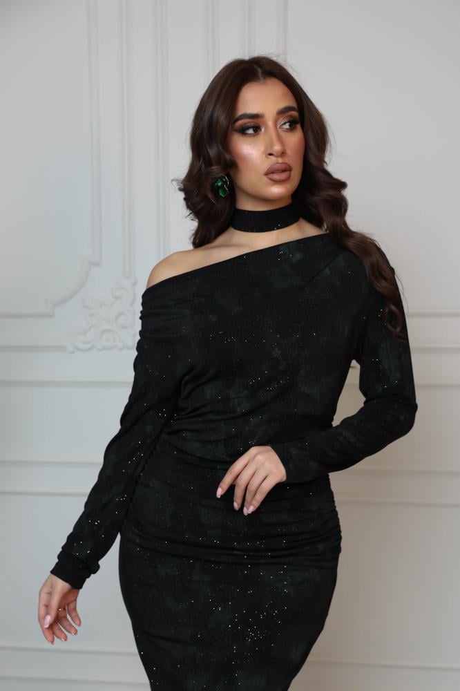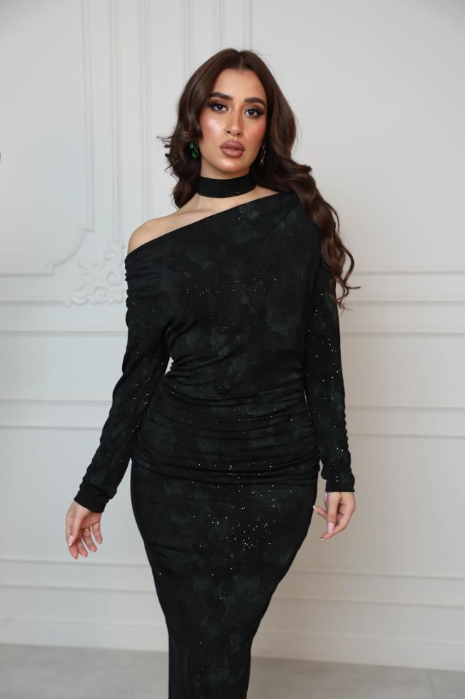 تألقي بإطلالة تخطف الأنظار مع هذا الفستان المموج بلون زيتي غامق بقصته الماسكة اللي تبرز جمال قوامك. تفاصيل التموج والثنايا من الأمام والجوانب تضيف لمسة أنيقة ومميزة، وأكمامه الطويلة مع الرباط الخارجي يكملون اللوك بلمسة راقية وعصرية.