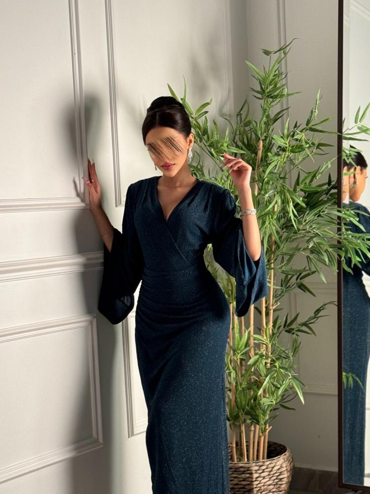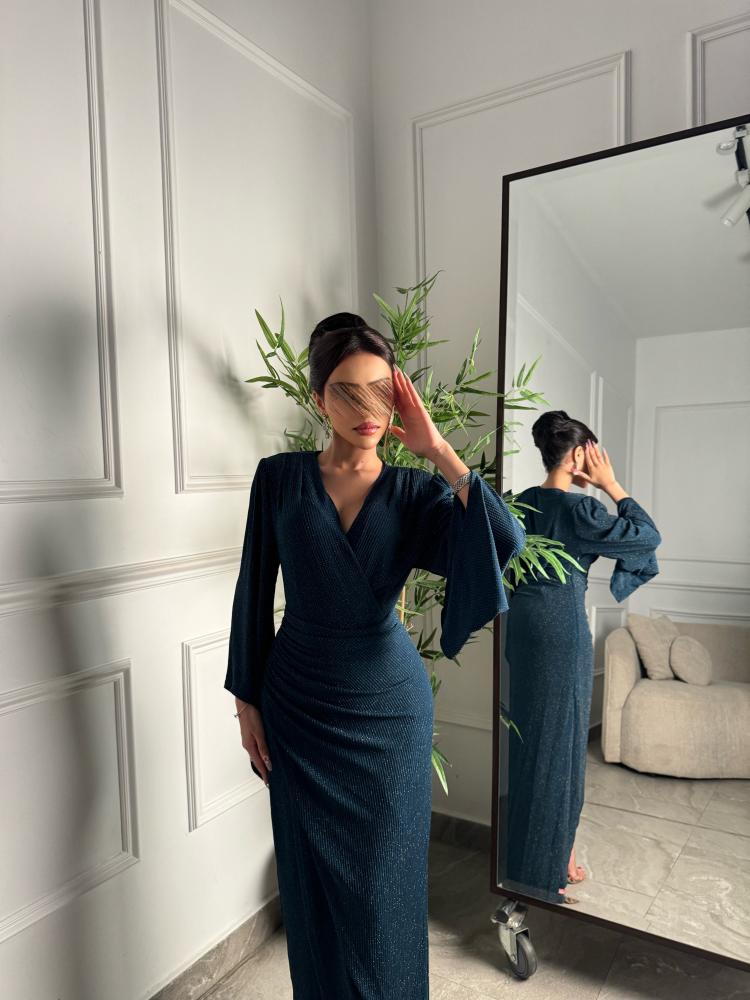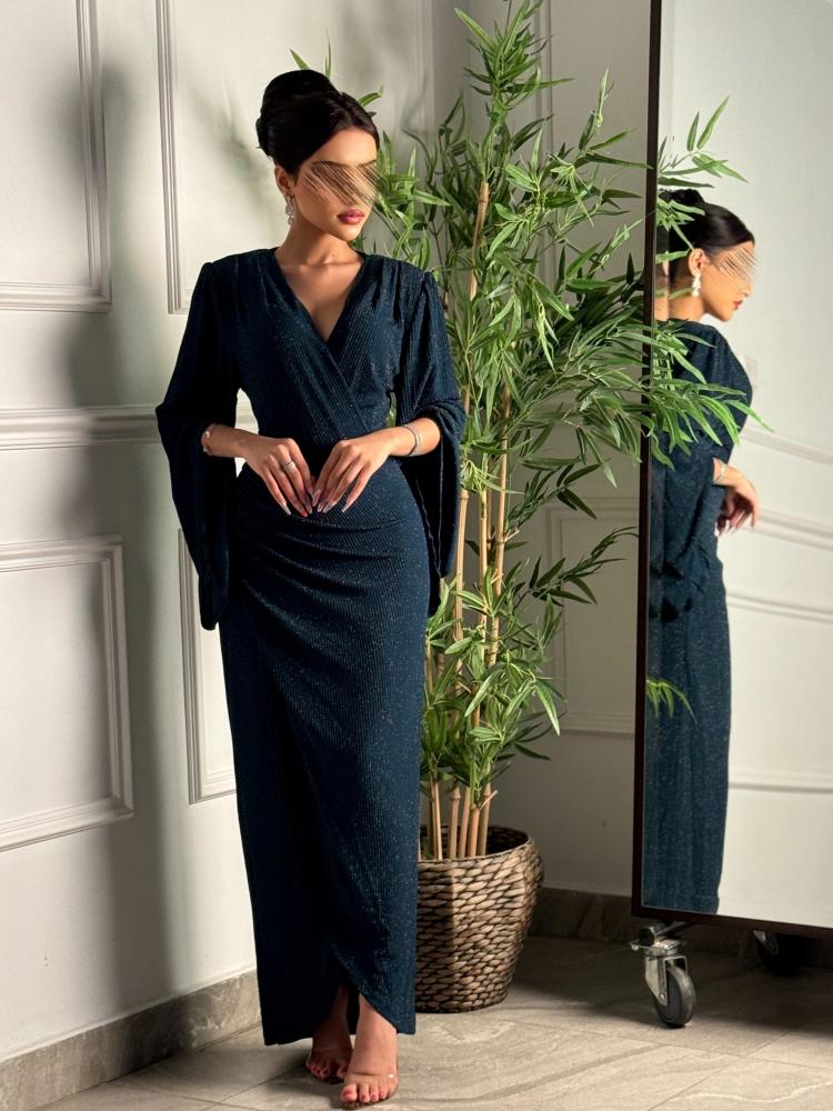 فستان استرتش بأكمام ميد غير متماثله الطول بقصة لف من الصدر مزين بثنايا على الجانب غير متماثل الطول