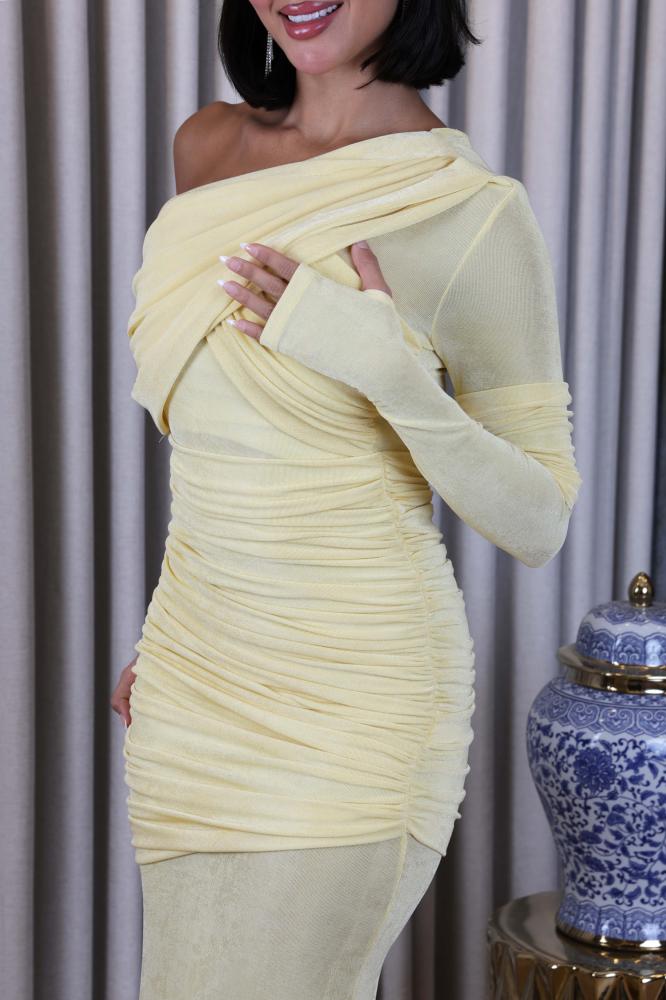 فستان سهرة أنيق بلون أصفر مشرق، يتميز بقصة كتف واحدة وانسيابية راقية، مع ثنايا مزمومة تُبرز جمال الخصر وتضفي لمسة أنثوية ناعمة. التصميم ينسدل بأسلوب ضيق من الأعلى ويتوسع تدريجياً بأسلوب أنيق نحو الأسفل، ليمنح الإطلالة طابعاً راقياً ومفعماً بالأنوثة. القماش الفاخر يكمّل الفستان بجاذبية تليق بالمناسبات الفخمة.