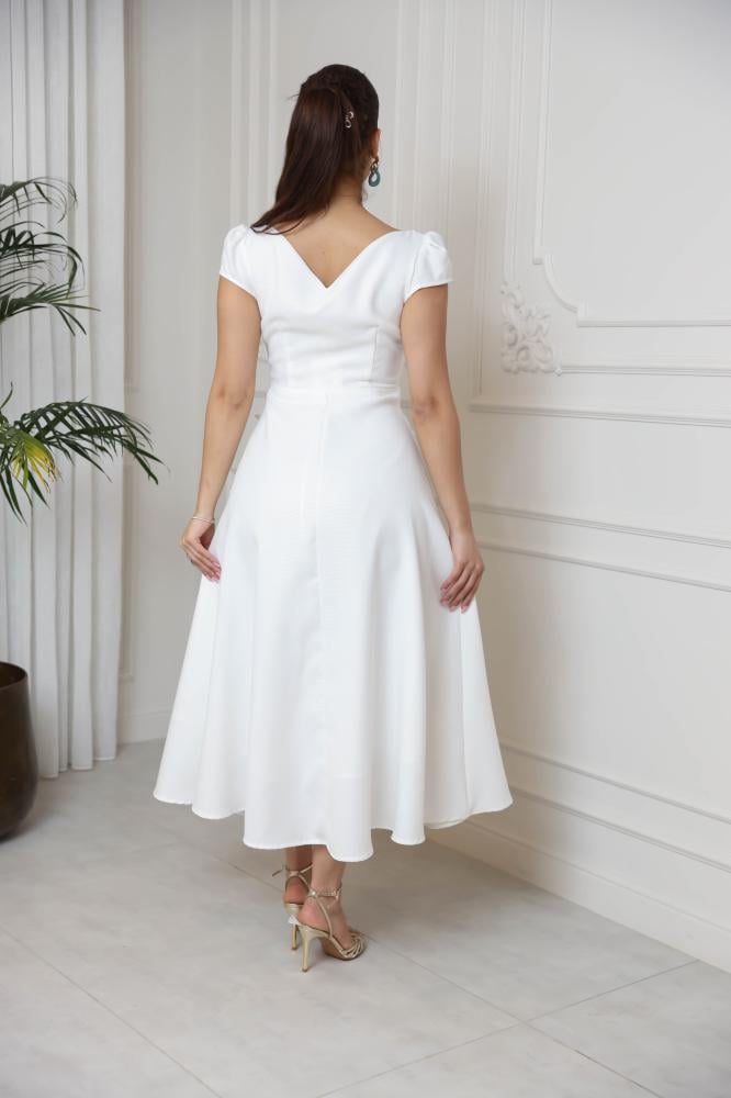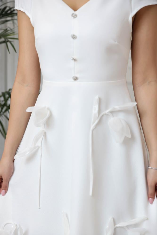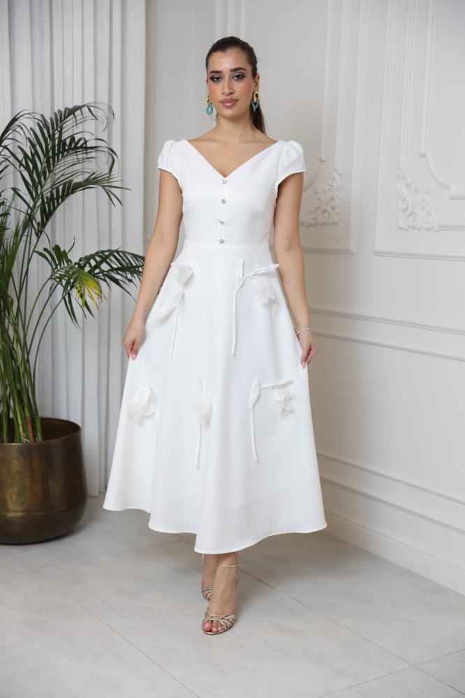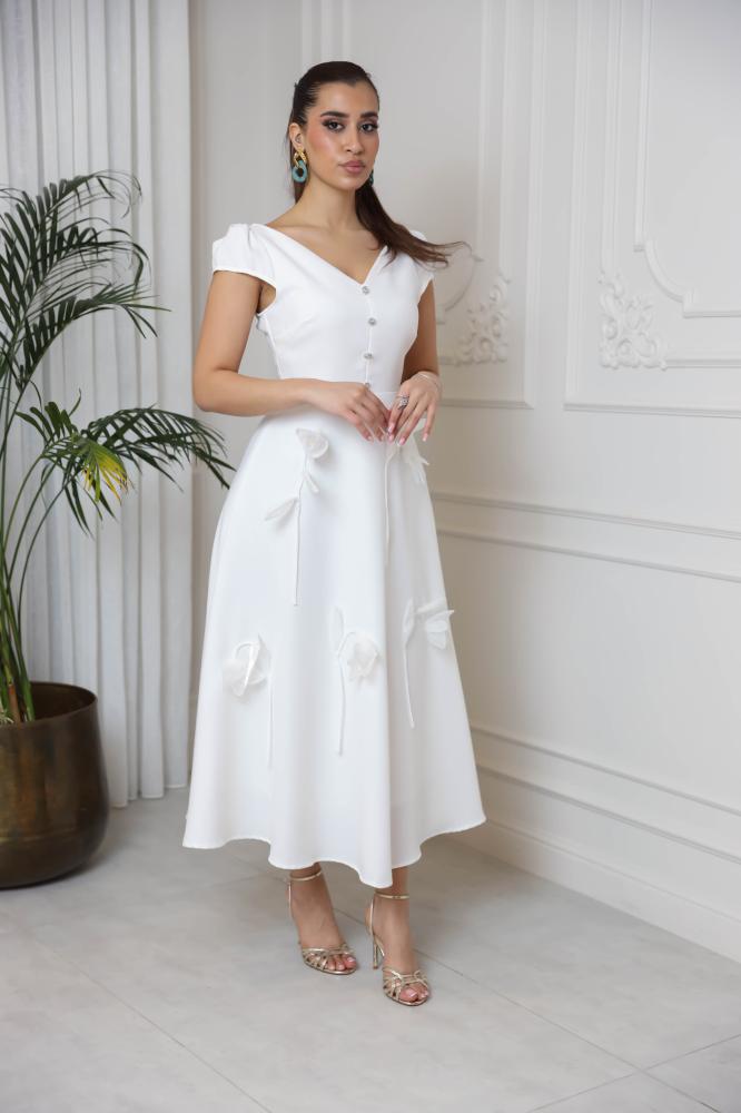 فستان ابيض بياقة V بأكمام مفتوحه مزين بأزرار كريستال على الصدر وبورود من الامام