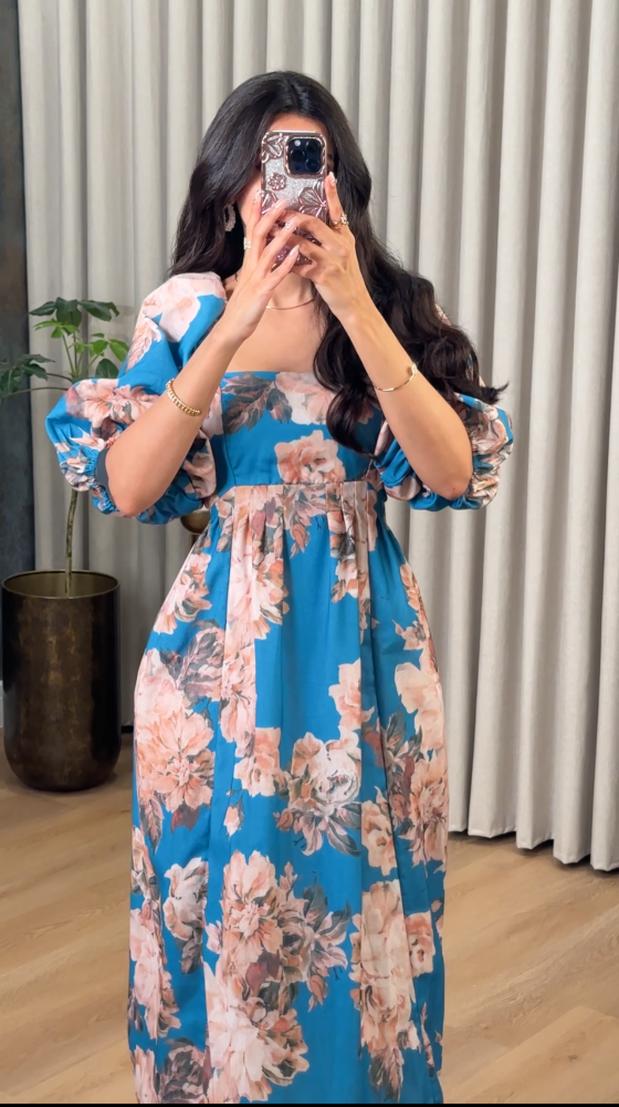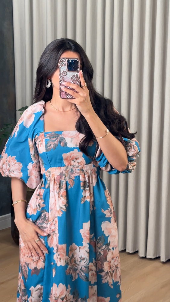فستان انيق بطابع مورد بياقة مربعة بأكمام قصيرة واسعة بزم من الأطراف برباط من الظهر وبفتحة