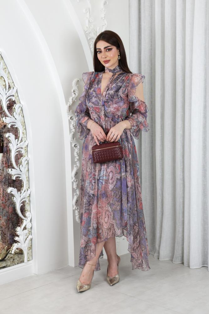 فستان اورجنزا ناعم بطابع النقش غير متماثل الطول بقصه لف برباط على الخصر بأكمام مكشوفه من الاكتاف مزينه بكشكشه وطبقات برباط ذاتي على الرقبة وبفتحه من الظهر
