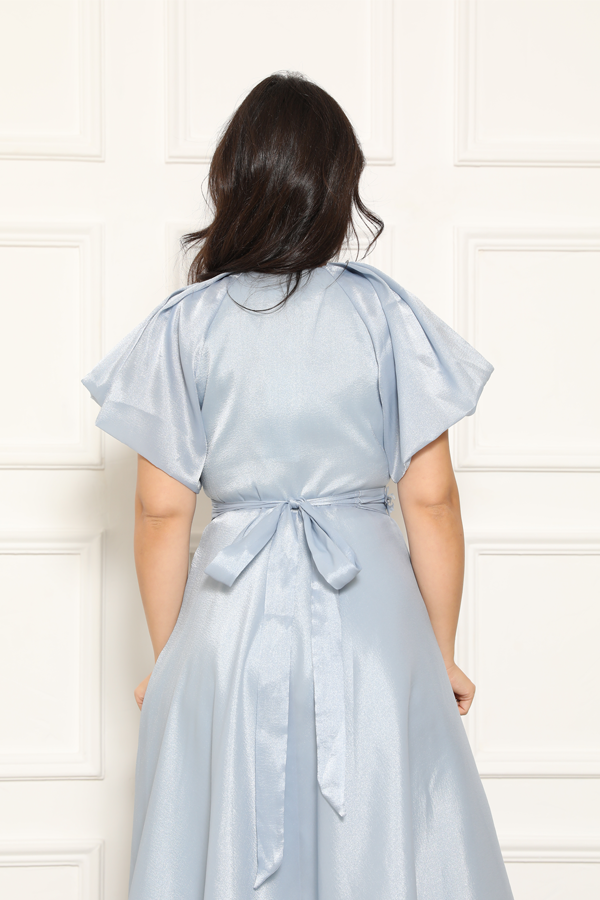 فستان اورجنزا ناعم كلوش غير متماثل الطول باكمام منتفخة قصيرة مثنية للداخل بقصة اللف من الصدر بحزام خارجي مزين بورود