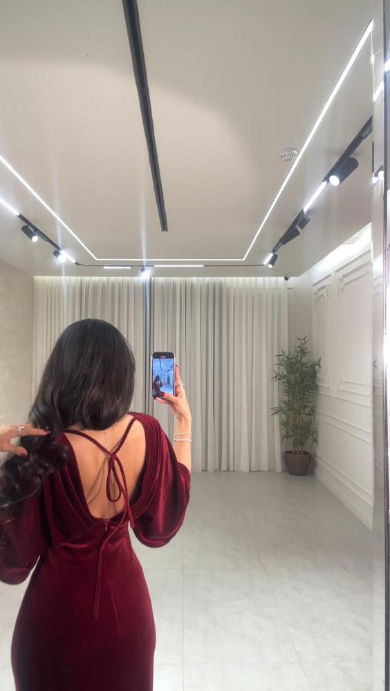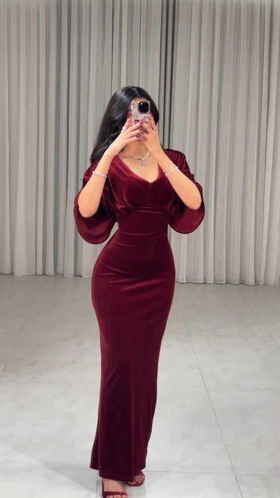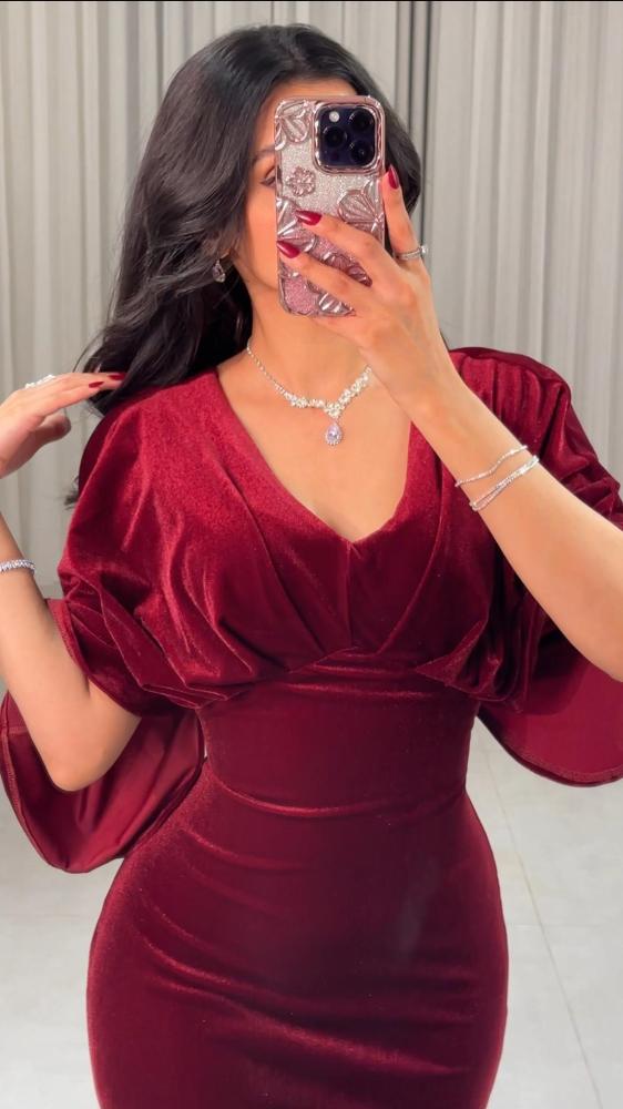 فستان برغندي ناعم بقصة V من الصدر بأكمام واسعة مزين بكسرات على الصدر وفتحه من الظهر