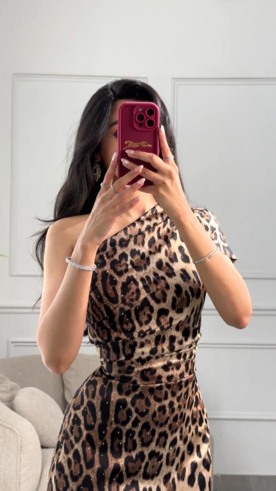 فستان بطابع نمري بقصة الكتف الواحد مزين بكريستالات صغيرة بالكامل وبكسرات على الصدر و الخصر وبسحاب من الخلف وفتحه من الأسفل