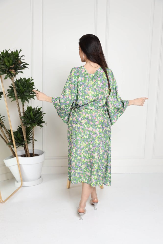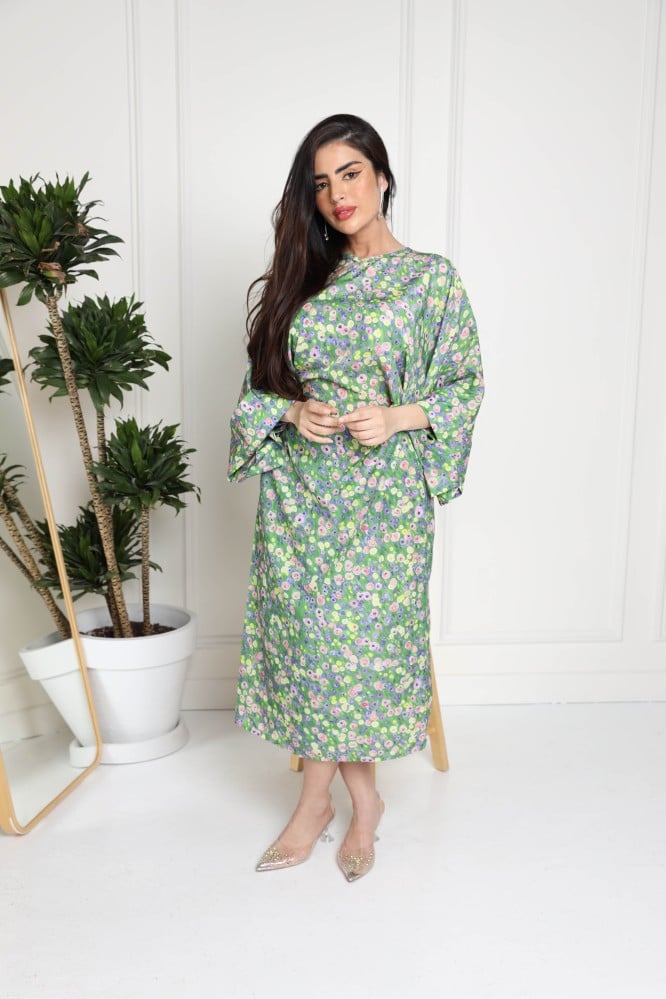 فستان بطابع ورود ملونة بياقة دائرية بفتحة من مائلة على الصدر باكمام مربعة مثنية من الاطراف بقصة لف من الاسفل .