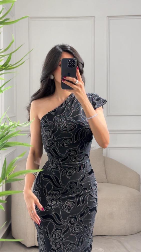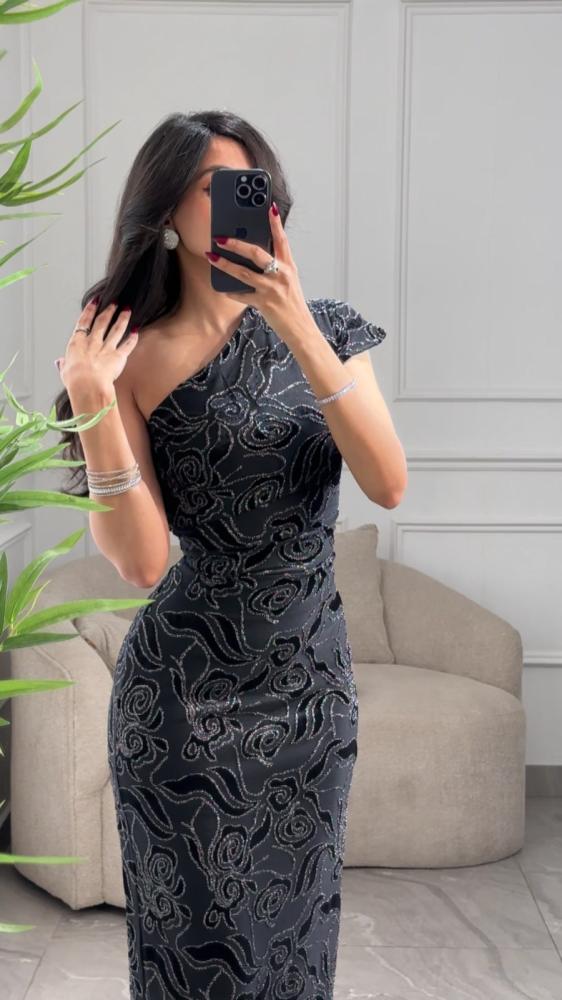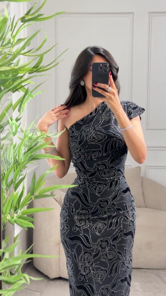 فستان سهره بنقش بارز بقصة الكتف الواحد بفتحة خلفية من الأسفل.