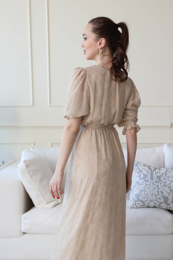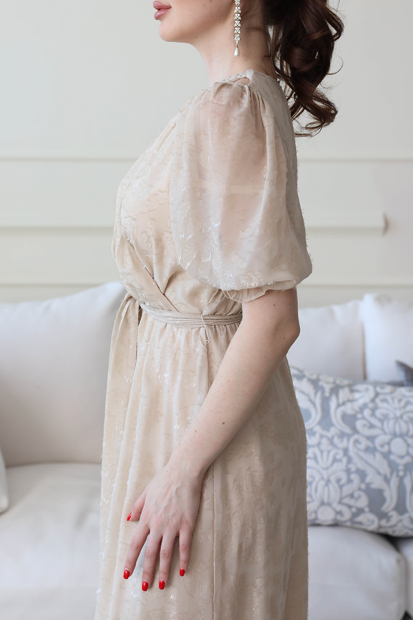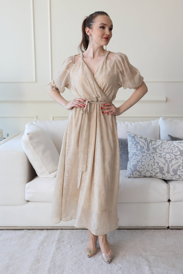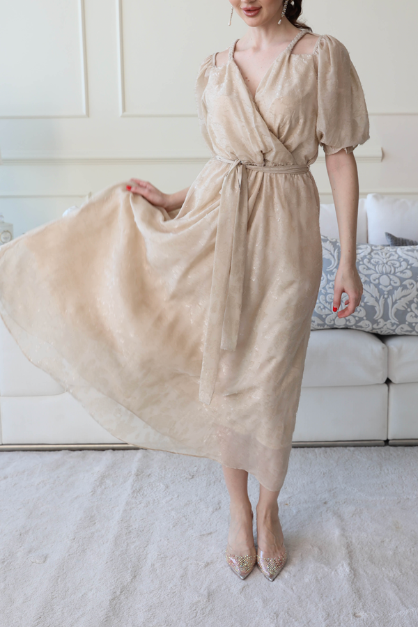 فستان شيفون مشغول بقصة لف من الصدر باكمام ميد مزمومة من الاطراف بحزام خارجي.