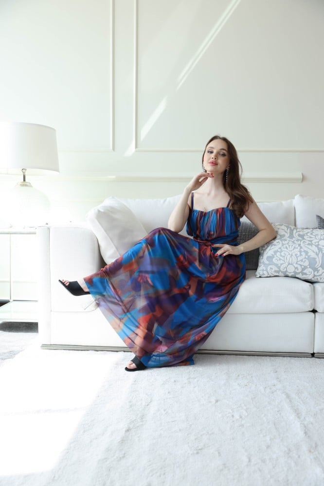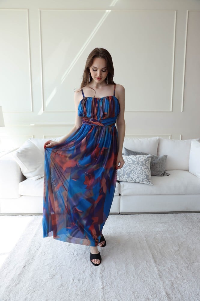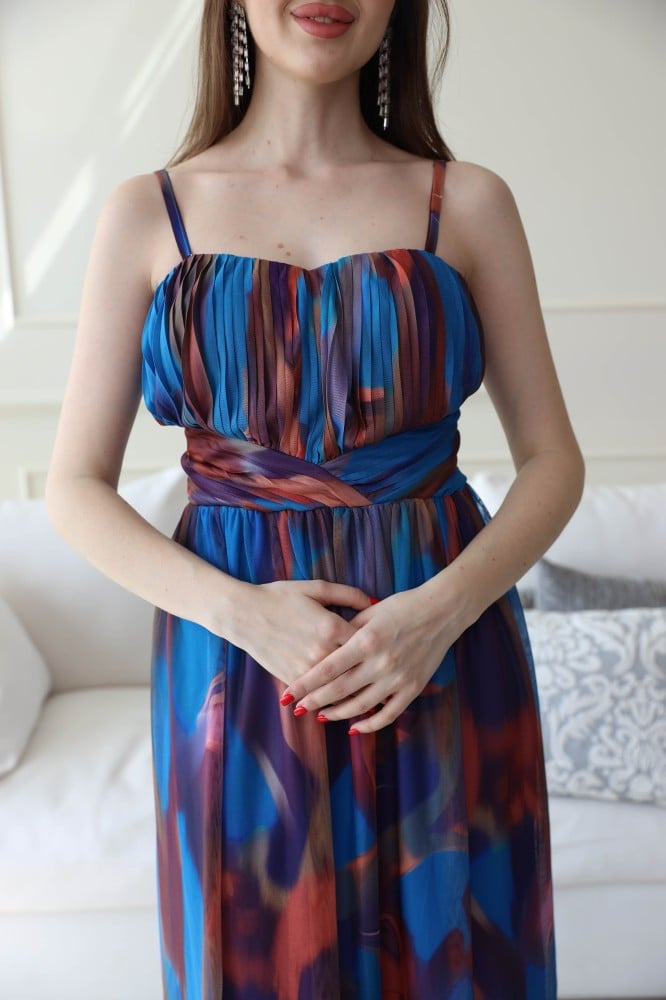 فستان تل استرتش بطابع مموج مزين بكسرات على الصدر والخصر .