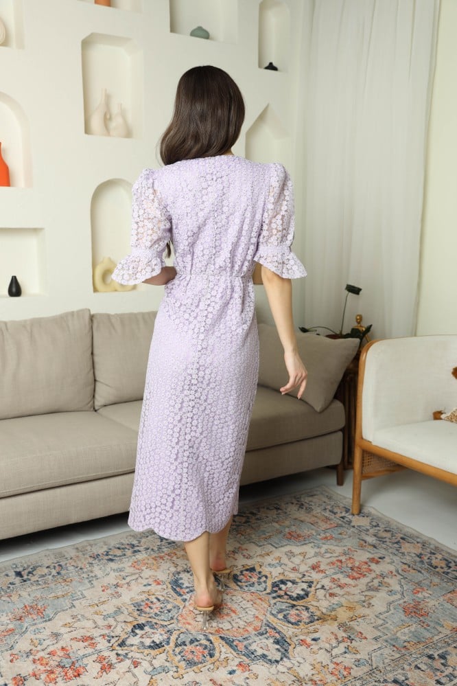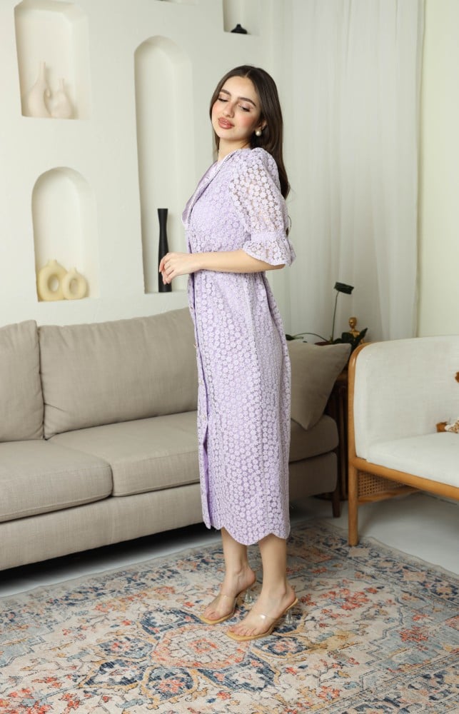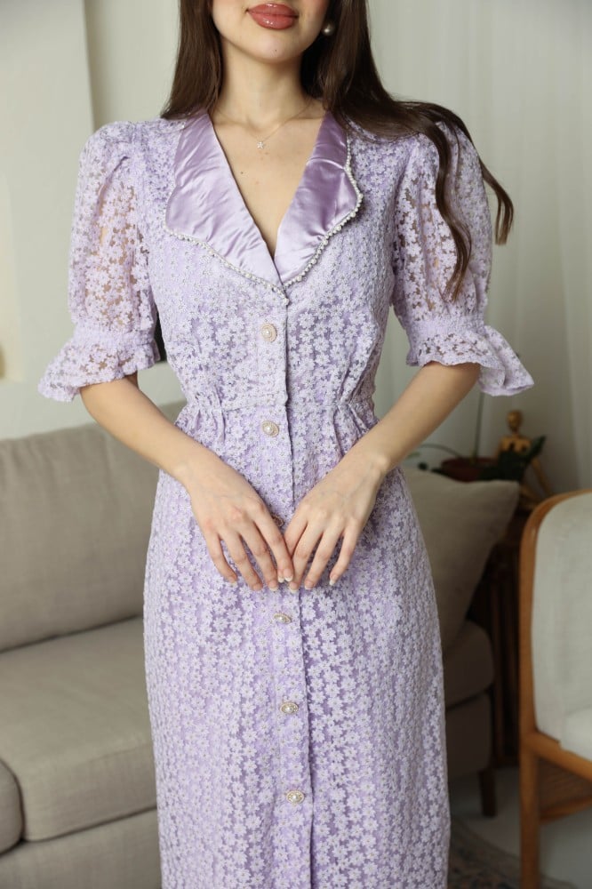 فستان ميد بتطريز الزهور بالكامل بأكمام ميد منتفخة بزم بياقة على الصدر مزينة بلؤلؤ و بأزرار لؤلؤ وكريستال من الامام