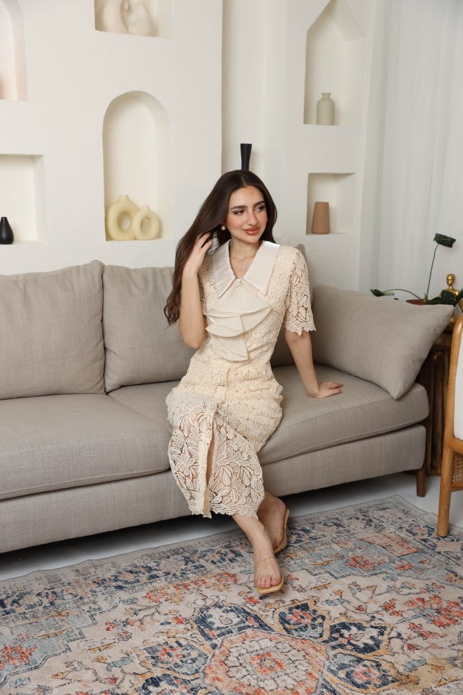 فستان جوبير بياقة فرنسي بدلعة على الصدر باكمام قصيرة مزين بجيوب امامية وبازرار لؤلؤ وكريستال من الامام .