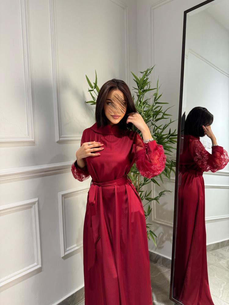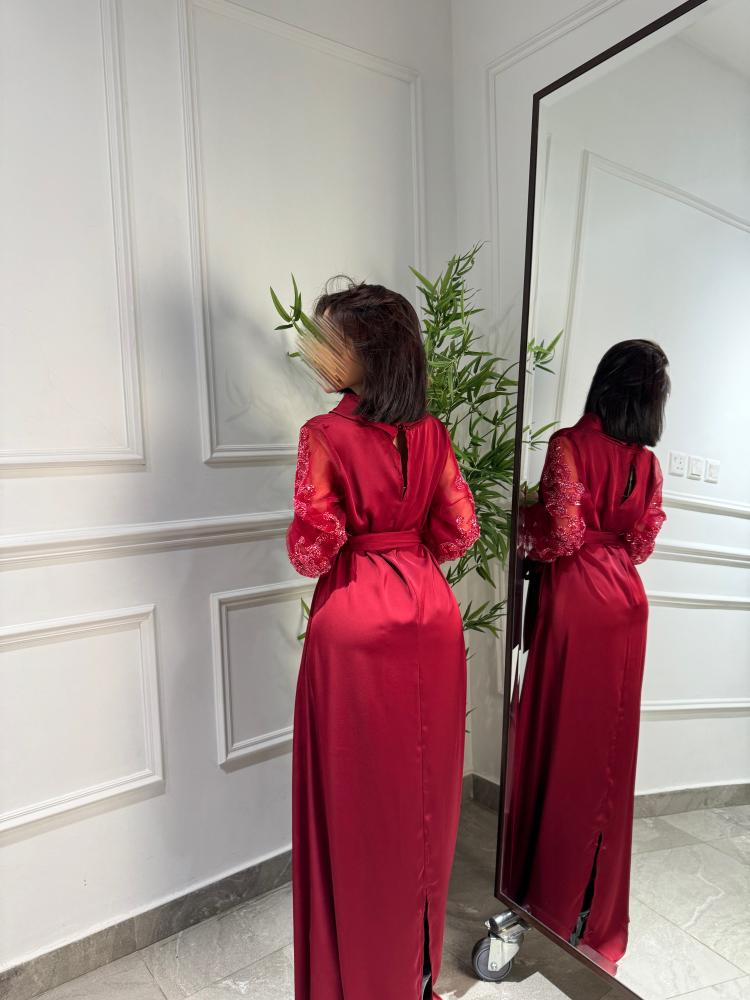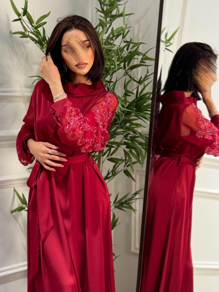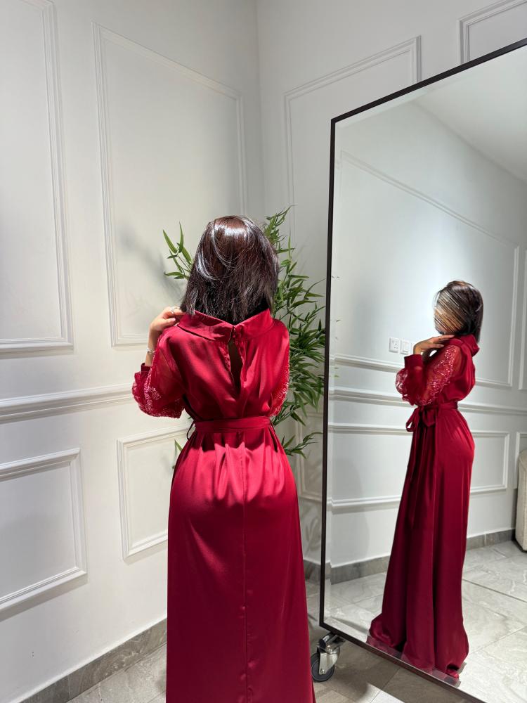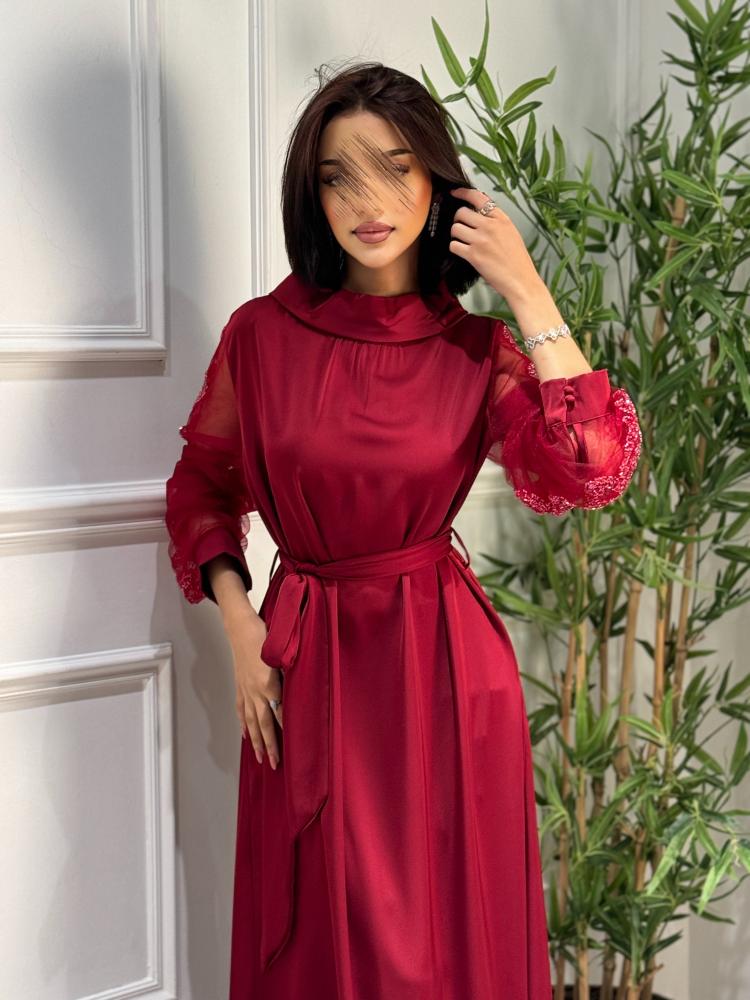 فستان حرير ناعم بياقة مرتفعة بأكمام تل مزينه بشك وترتر بأزرار على الكم بحزام خارجي
