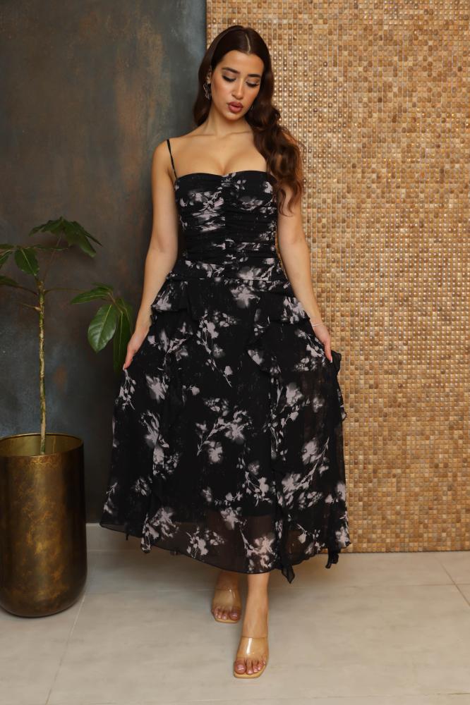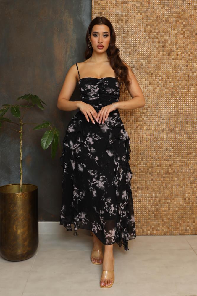 فستان حفر ناعم بطابع مشجر مزين بطيات على الصدر ومن الخلف وبدلعات مكشكشه من الجوانب