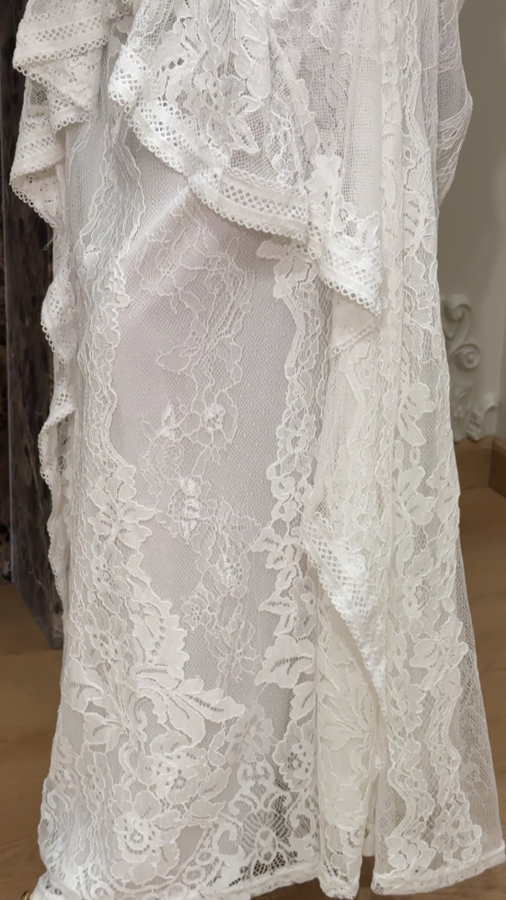 فستان دانتيل بياقة V باكمام قصيرة واسعة مزين بحلقة على الخصر وفتحات جانبية بفتحة من الظهر وحزام ذاتي من الخلف _ من الأسفل مزين بدلعة مكشكشة من الامام والجوانب _ و بسحاب من الخلف