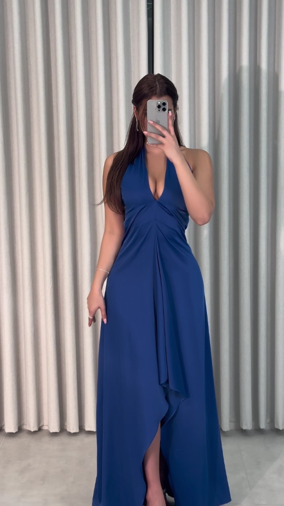 فستان ساتان أنيق برباط حول الرقبة، يتميز بفتحة جذابة من الصدر والظهر، مع قصة مفتوحة من الأسفل .