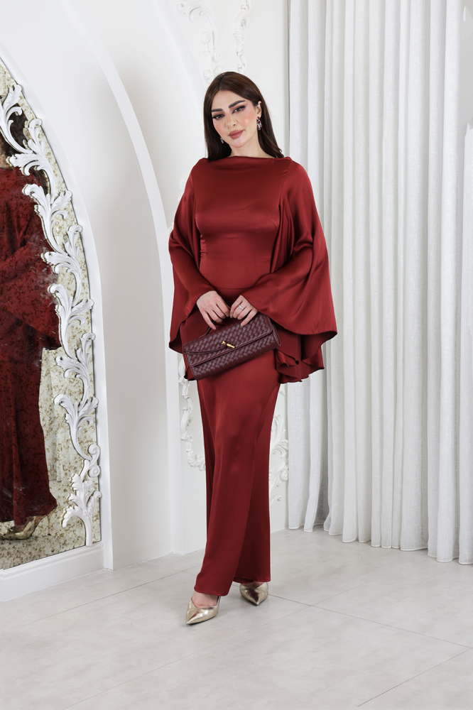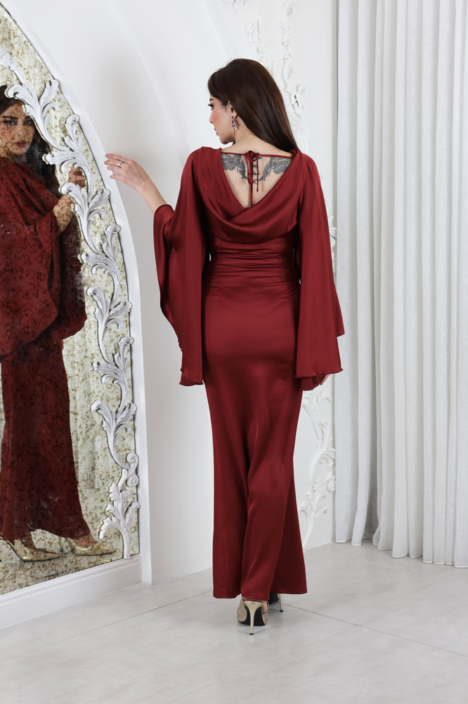 فستان طويل من الساتان بلمسة عصرية، يتميز بأكمام واسعة وأنيقة كلوش ورباط خلف الرقبة لإطلالة جذابة ومتألقة.