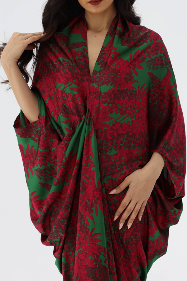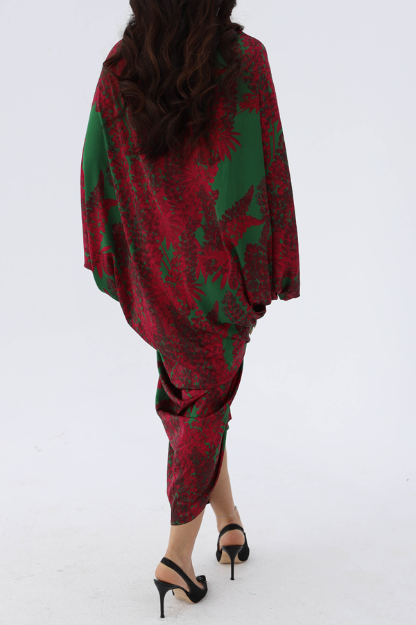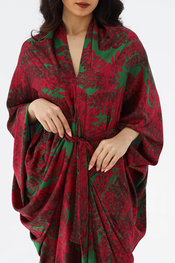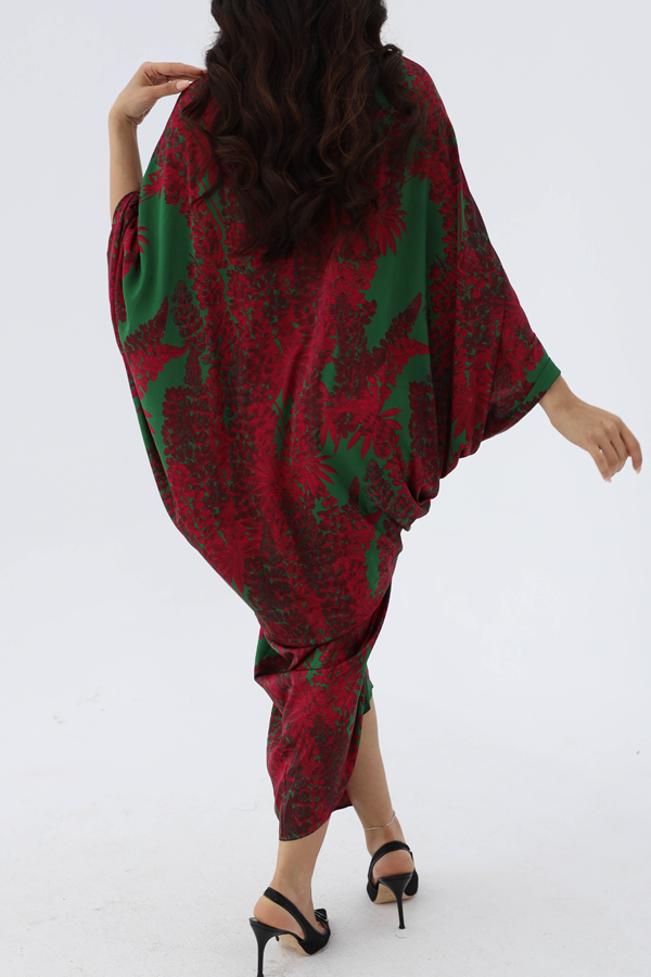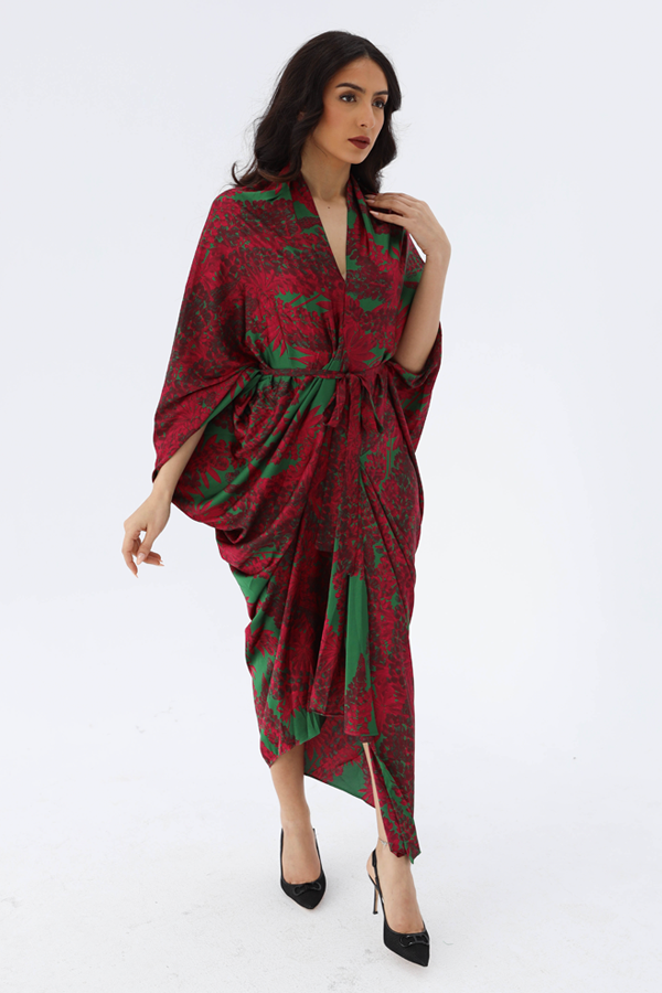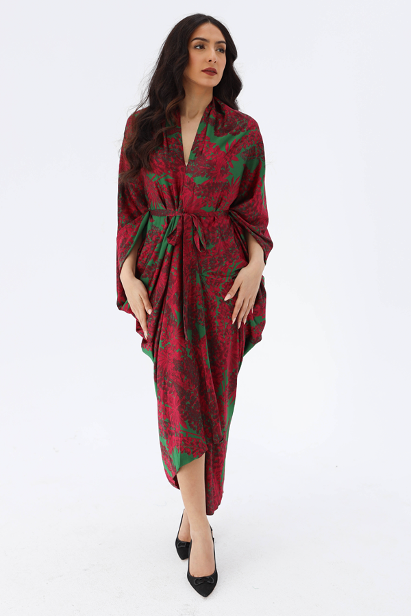 فستان ميد غير متماثل الطول بقصه حديثه مثنيه على الخصر باكمام واسعة بحزام خارجي.