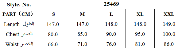 الرقبة مزينة بكريستالات فاخرة كبيرة الحجم تضفي بريقًا جذابًا، فيما تأتي الأساور مطرزة بأحجار صغيرة وكريستالات متدرجة الحجم تمنح إطلالة لامعة ومبهرة. الفستان مصنوع من قماش مرن وخفيف يضمن الراحة والانسيابية مع الحركة، مع قصة ملتفة عند الأسفل تضيف لمسة عصرية أنيقة.