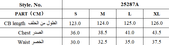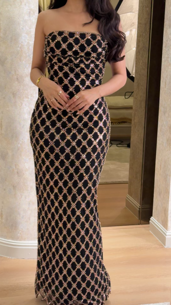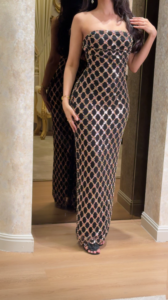 يأتي بقصة ضيّقة تبرز جمال القوام، مصمّم من قماش فاخر ينسدل بانسيابية على الجسم ليعكس الأنوثة بكل أناقة. مزين بنمط خطوط متشابكة من الشك الفاخر والترتر البراق باللون البرونزي، يضفي لمسة ساحرة تتلألأ مع كل حركة.