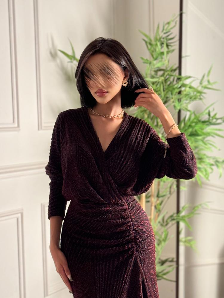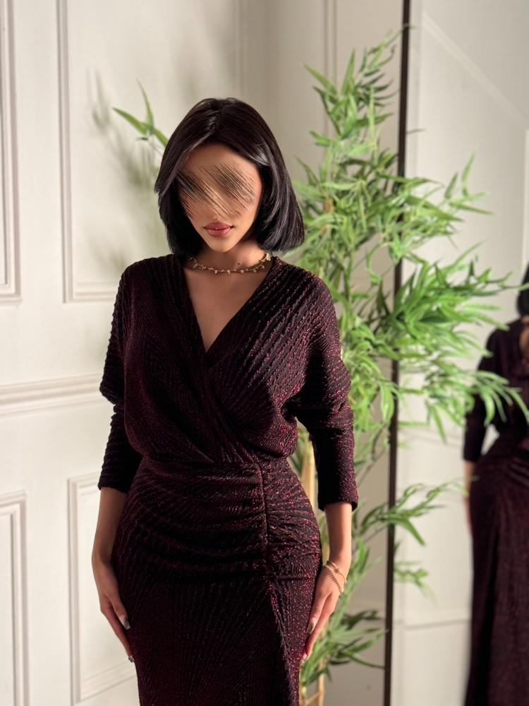 فستان سهره استرتش بأكمام طويلة بقصة لف من الصدر وبزم على الخصر مزين بثنايا متداخلة على الخصر ومن الخلف بفتحه امامية من الاسفل