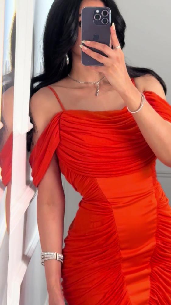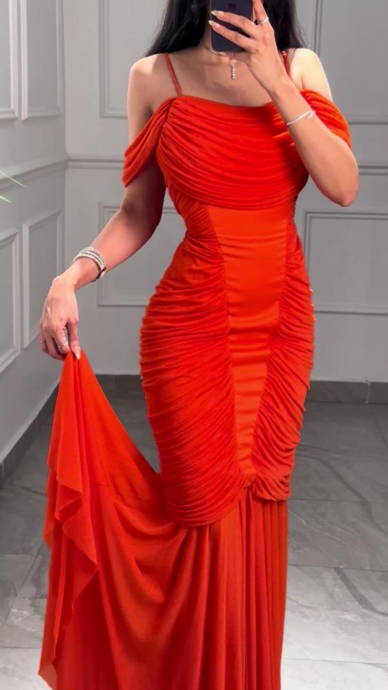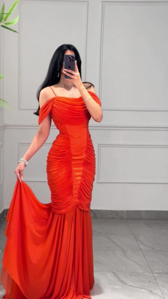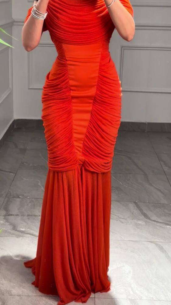 فستان سهرة طويل حفر اوف شولدر من الاكمام مزين بثنايا على الصدر ومن الأسفل غير متماثل الطول