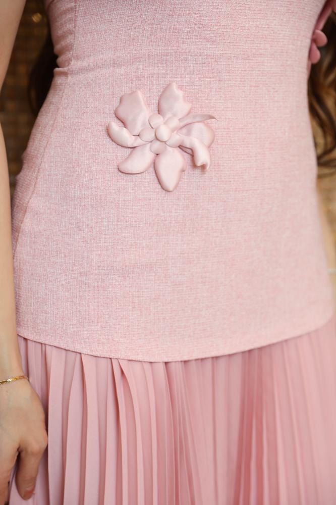 فستان شانيل بدن اكمام مزين بورود على الاكتاف و الصدر بتداخل كريب كسرات من الأسفل وبسحاب من الظهر