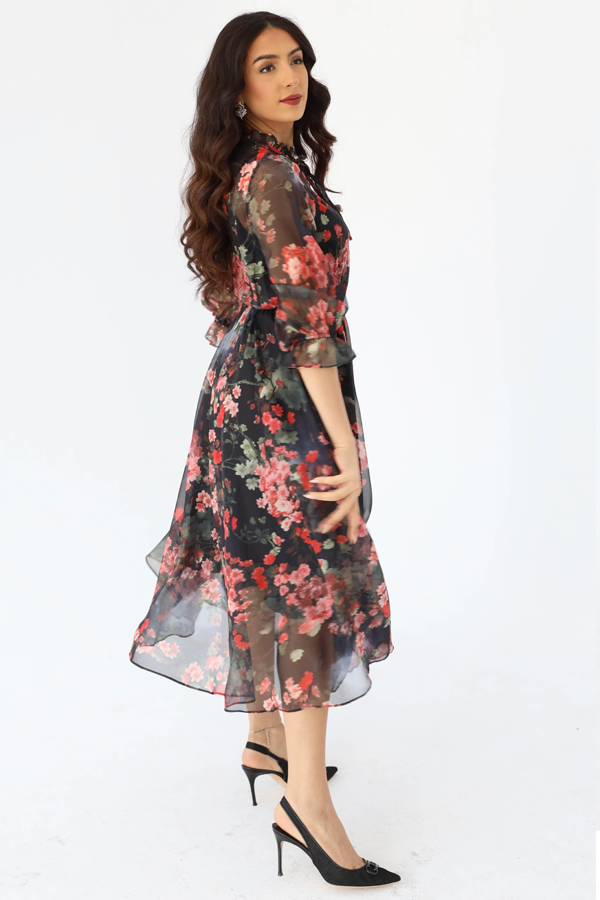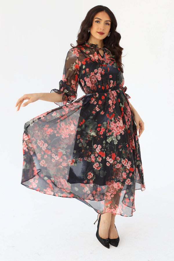 فستان شيفون مورد بياقة مرتفعة مكشكشة وبرباط باكمام ميد مزمومه ومكشكشة من الاطراف بزم من الخصر.