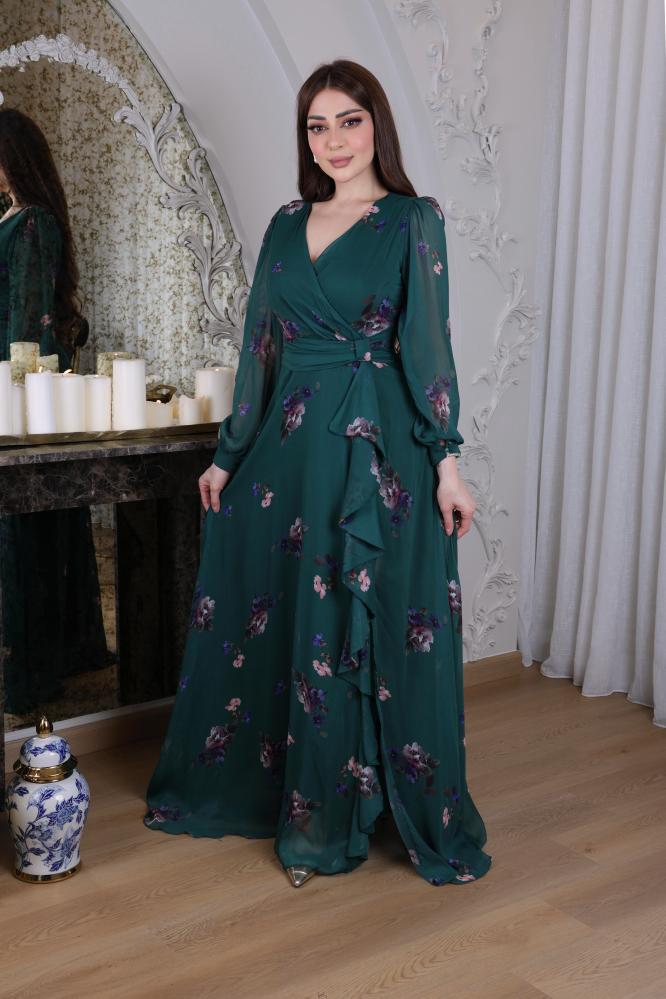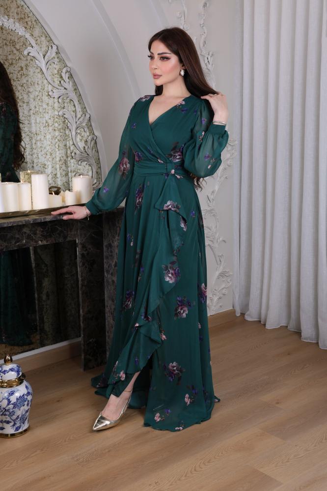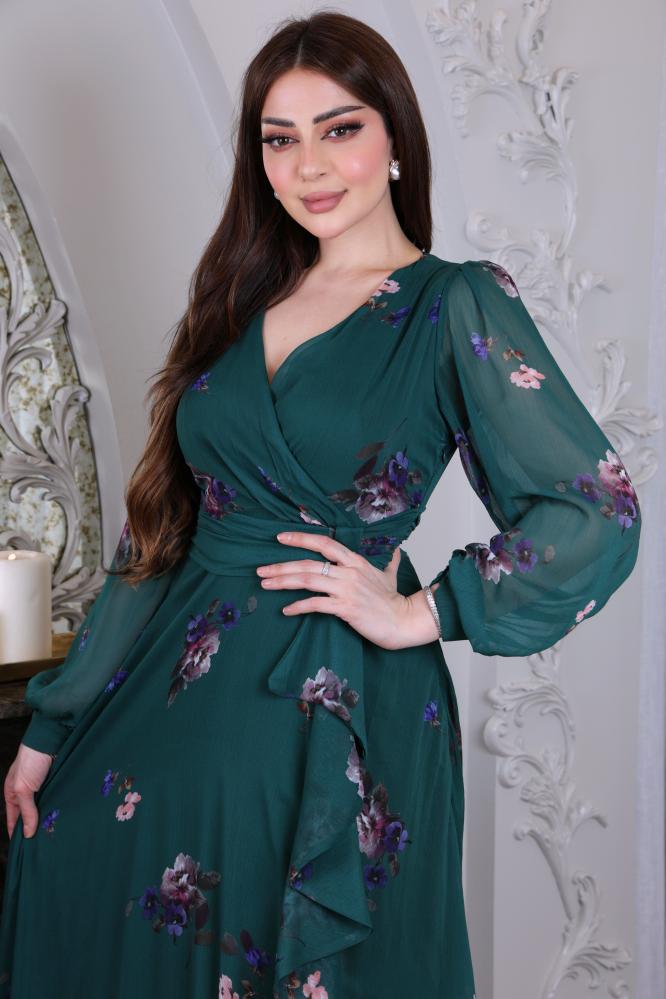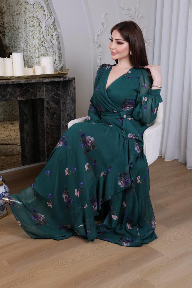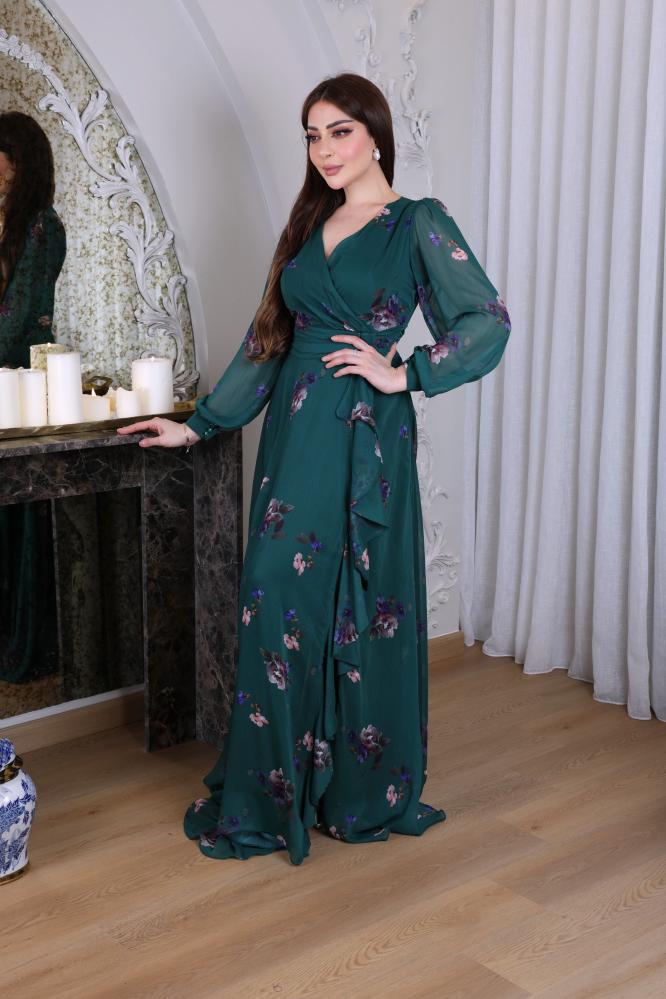 فستان شيفون ناعم بطابع ورود بقصة لف من الصدر بأكمام طويلة شفافة و ازرار على الكم مزين بحزام ذاتي على الخصر بفيونكه بدلعة من الامام وفتحة جانبية.