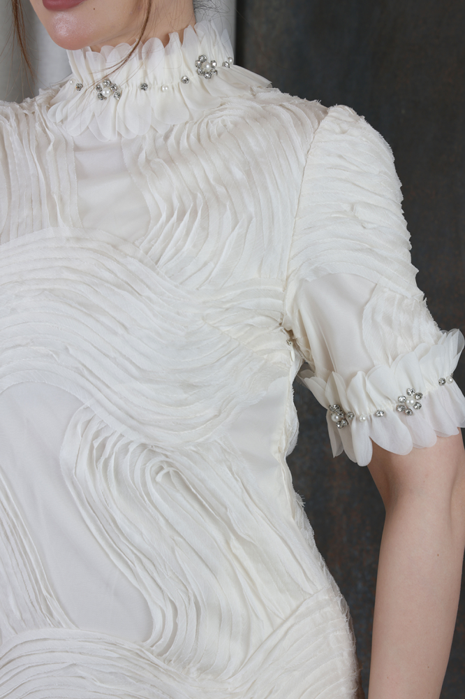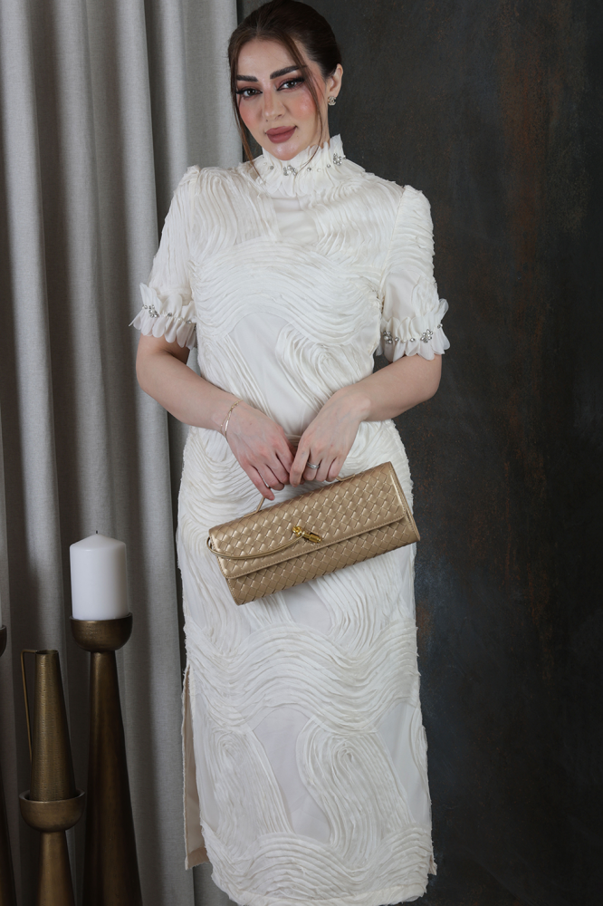 فستان العيد منسوج بتل و شيفون بارز بنمط مموج بياقة مرتفعة مزينه بكشكشه الإكسسوار بأكمام قصيره مزينه بكشكشه واكسسوار من الأطراف