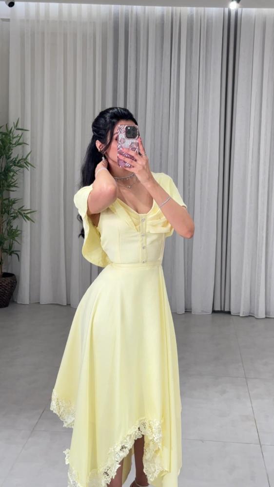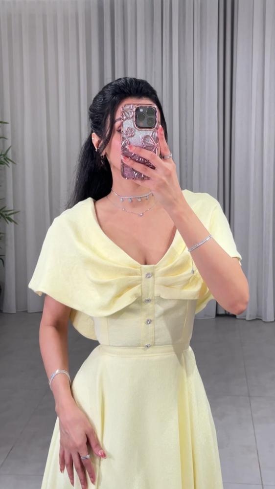 فستان اوف شولدر غير متماثل الطول مزين بكسرات على الصدر وبازرار كريستال , بدلعه على الاكتاف مزينة بزم من الخلف , بكلف دانتيل من الاسفل وبحزام خارجي