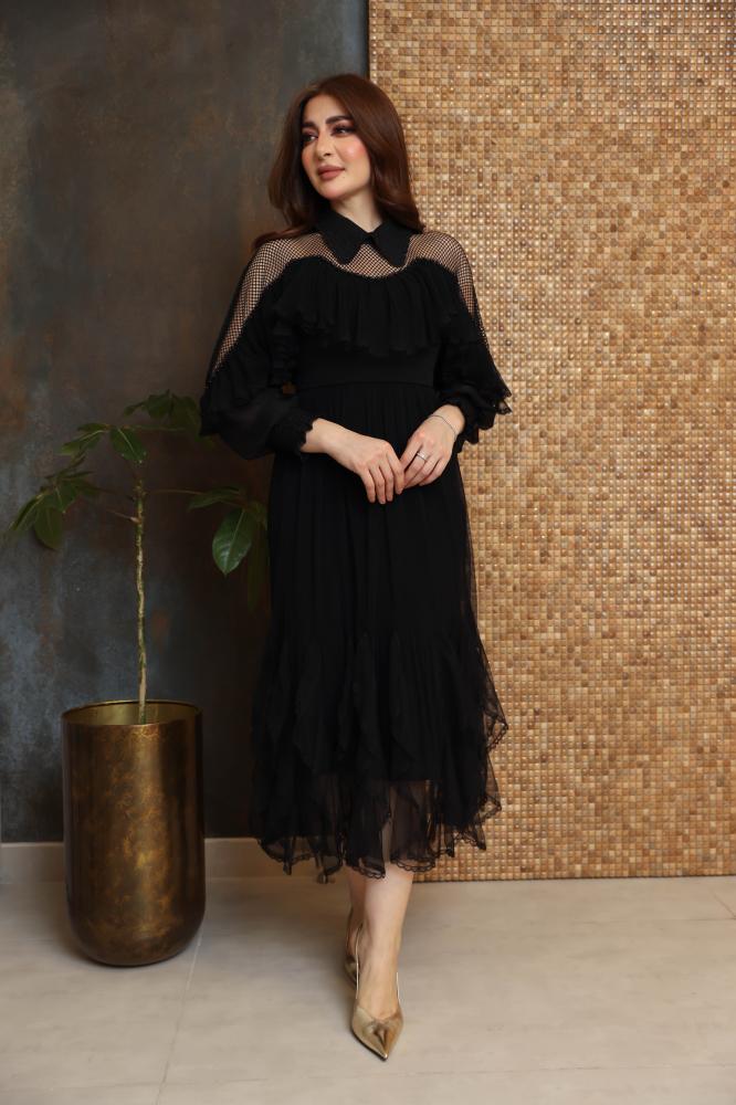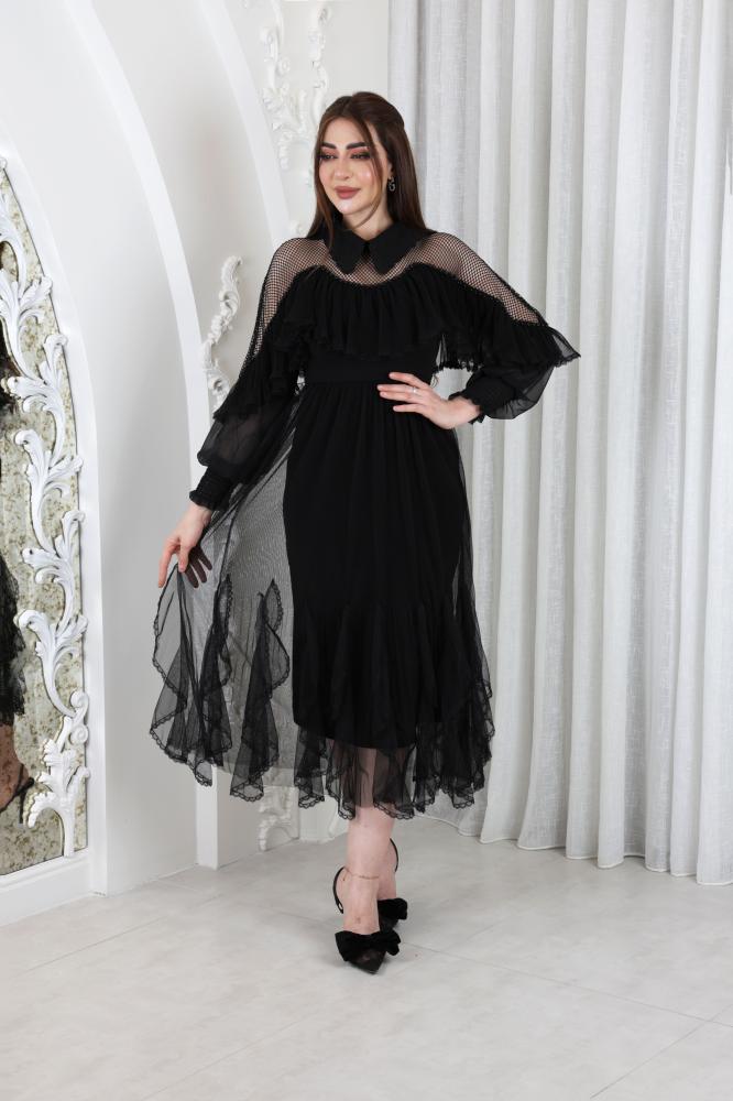 فستان فخم بياقة فرنسي مطرزه بنمط الورود بأكمام بف طويلة مزمومه من الأطراف بشبك من الصدر وبدلعه التل المكسر على الصدر والاكمام يزينها دانتيل من الأطراف بقماش كريب من الصدر ومزين مكسر بنمط جميل من الافل وبدلعات