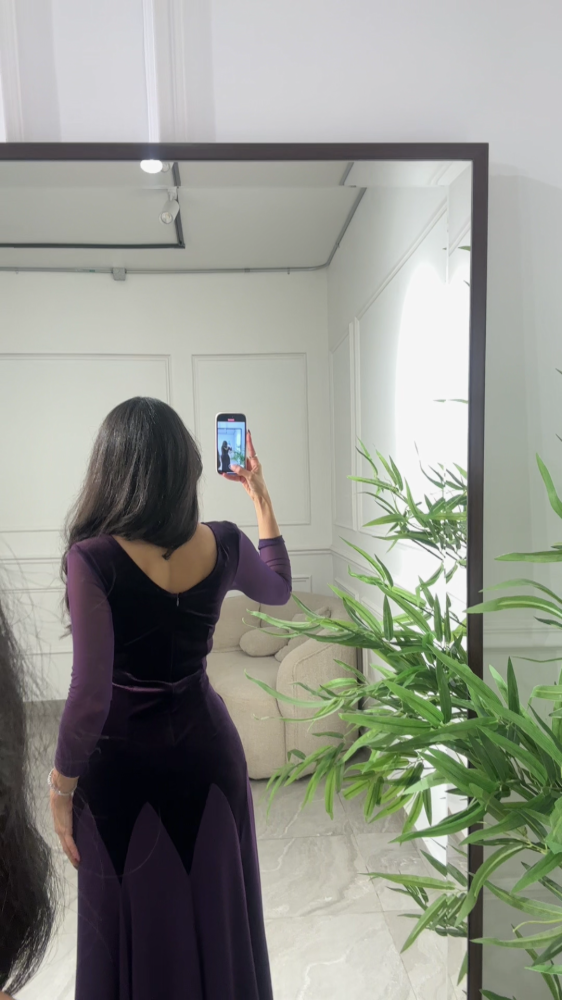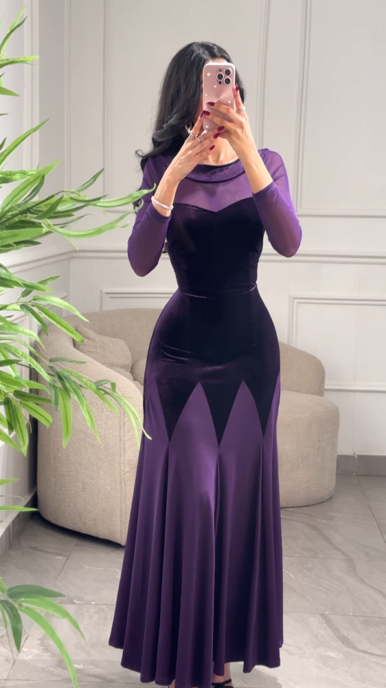 فستان بياقة دائرية باكمام حيران مزين بتطعيمات من المخمل والتل الناعم بقصه كلوش من الاسفل بسحاب من الخلف