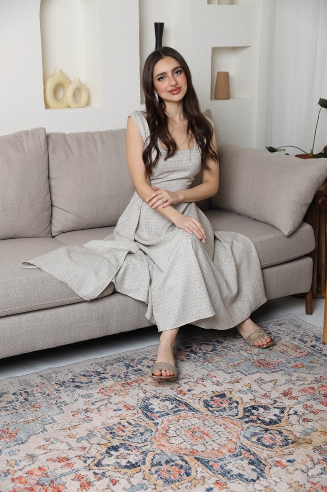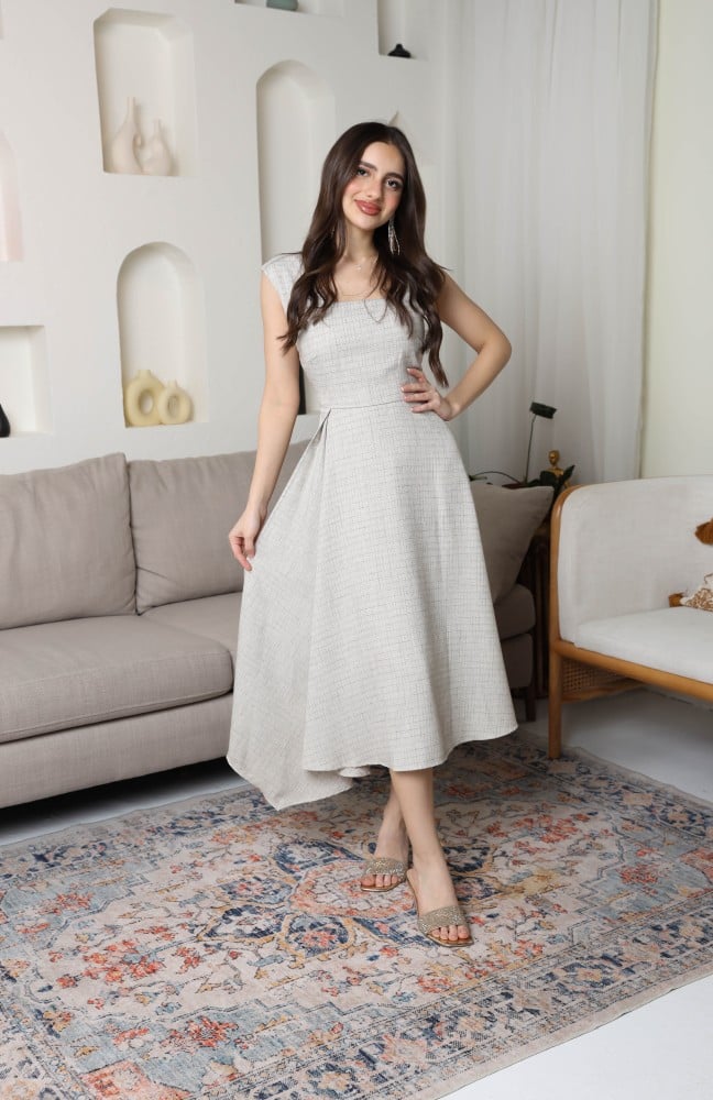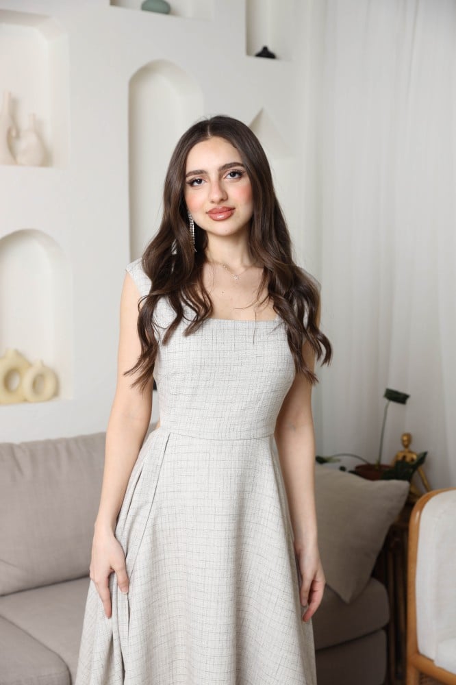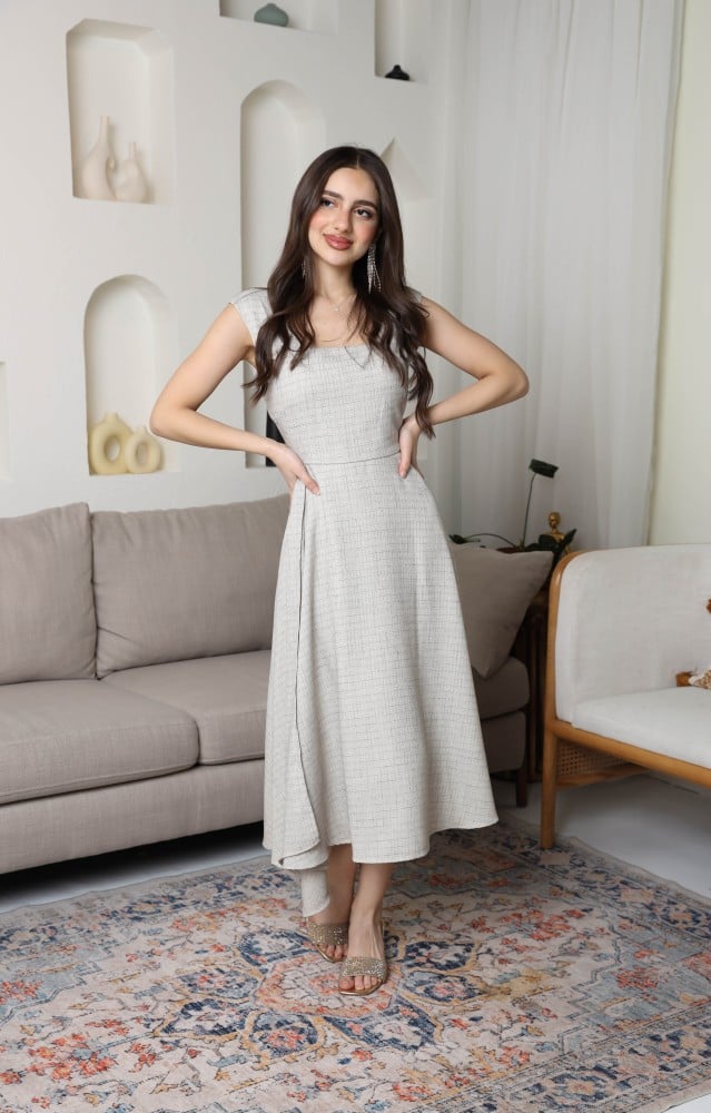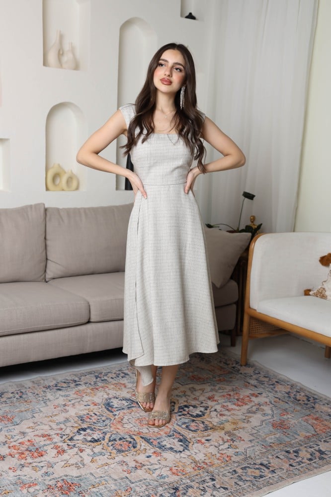 فستان كاروهات ميد غير متماثل الطول بدون اكمام بياقة مربعة بفتحات على الخصر من الجوانب وبدلعه على الجانب .