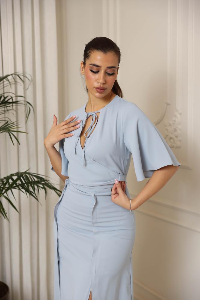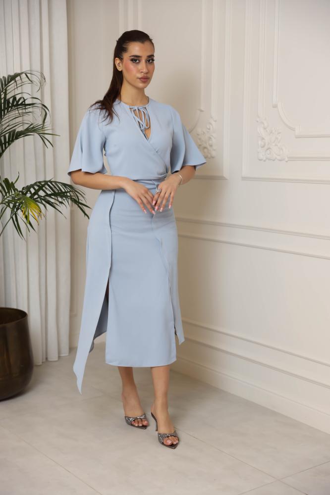 فستان كريب فائق الأناقة والرقي، يتميز بتصميم مبتكر يجمع بين البلوزة والتنورة المتصلة بأسلوب متقن ومتناغم. يأتي بقصة لف ساحرة من الأعلى، تضفي على التصميم لمسة أنثوية جذابة ورشيقة. يتميز الفستان برباط أنيق عند منطقة الصدر، يبرز جمال التفاصيل ويعطي مظهراً عصرياً ملفتاً. يتألق بفتحتين أماميتين جريئتين من الأسفل، تمنحانه طابعاً حيوياً وانسيابياً مع كل خطوة، مما يجعله قطعة فريدة ومثالية لكل امرأة تبحث عن التميز.